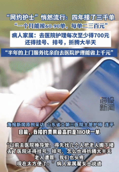 不是护士扮演!山东济南,“网约护士”突然流行起来,而且业务迎来爆发式增长,甚至有护士在四年的时间内,完成“网约护士”上门服务近三千单,一个普通订单的成交金额约二三百元,护士本人到手约70%。网友:“我有个大胆的想法,但可能“刑”不通!” (来源:海报新闻) 有网友认为护士只是打针喂药,所以觉得网约护士可能涉及非法行医等问题。 实际上,网约护士干的是这样的活: