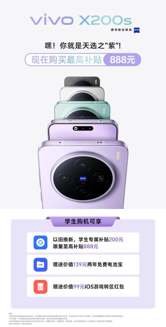 [购物车R]想要入手vivo X200s和vivo X200 Ultra的宝子,建议趁着6.1-6.30大促拿下!现在还有学生专属以旧换新活动可以补贴200元,限量至高补贴 888 元!同时还赠送价值 139 元两年免费电池宝,和价值 99 元 iOS 王者荣耀转服红包,是真的有给学生党实实在在的福利了!