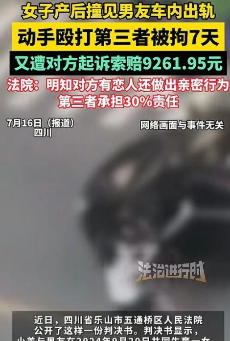 天理何在?四川乐山,一女子剖腹产,为男友生下女儿,刚办完满月,来到停车场送亲友,突然看见男友和另外一位女子在车里,那女子坐在男友腿上,女子气不过,拉开车门,将她拉出来就打,男友吃里扒外,报警后将女子带走,拘留7天,罚款300元,而那女子住院6天,鉴定为轻微伤,她告到法院,向女子索赔9261.95元,法院的判决令人大呼意外! 我刚给他生完孩子!孩子刚办完满月酒啊!他居然就在车里乱搞!” 四川乐山的小美(化名)愤怒的嘶吼道。 小美和男友在一起很多年,俩人同居一起生活。2024 年 9 月 20 日,两人共同迎来了女儿的降生,满心欢喜。 为了庆祝女儿出生,11 月 4 日,家里人热热闹闹的办了满月酒,这本该是新生命带来的幸福延续,谁能想到,第二天,生活就给了小美沉重一击。 那天,小美和亲属们在停车场,准备送亲属离开,告别完后,小美意外撞见男友的车里,有个女子和男友在车里,亲密的样子刺痛了小美的眼睛。 刚经历生产,还在产后恢复期的小美,瞬间气血上涌,十分愤怒,她忍无可忍冲过去把那女子从车上拉下来,一顿殴打。 男友见状,先是制止小美,后来发现没用,只好打电话报警,警察到来,才让俩人分开。结果到医院检查,那女子被评估为轻微伤,住了6天医院。 而小美因为殴打他人,被行政拘留 7 天,还被处以 300 元罚款。本以为事情到这暂时告一段落,可没想到,那女子一纸诉状将小美告上法庭,索赔 9261.95 元,这让小美陷入了更复杂的处境。 这件事里,小美经历了产后的辛苦,又遭遇男友背叛,愤怒之下的冲动行为,让自己面临拘留和赔偿。而该女子明知对方有恋人还参与亲密行为,也没躲开责任。 而那个引发事端的男友,好像在这一系列事件里,没看到明显的法律惩处,却把两个女人推进了这样难堪又伤人的局面。 法庭上,事情的细节慢慢明晰。该女子是知道小美和男友是情侣关系,还有了孩子,却依然和男方做出亲密行为。法院审理认为,这种明知对方有恋人还去越界的行为,本身就有过错,是导致小美情绪激动动手的诱因之一。 所以,在判定责任时,酌定小芳自己承担 30% 的损失。最终,一审判决小美支付女子损失 2552.40 元 。 这事在网上传开后,网友们炸开了锅。有网友说:“这小三也太不要脸了,明知道人家有孩子有伴侣,还往上凑,自己作出来的事儿,就该承担后果!” 这事儿也给大家提了个醒,遇到再生气的事儿,也得想想冲动的代价,同时,那些破坏别人感情的行为,不管是道德上还是法律层面,也别想全身而退 。 对于这件事,大家有什么想说的呢?欢迎在评论区分享。
