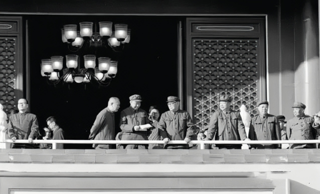 天安门城楼上,当时的党和国家领导人。左起:纪登奎,李先念,华国锋,叶剑英,陈锡联,汪东兴和许世友。李先念正在和华国锋交谈,华国锋目光含笑,叶剑英元帅,陈锡联和许世友两位开国上将,也扭过头往华国锋这里看,目光含笑。一看就知道,华国锋是中心。