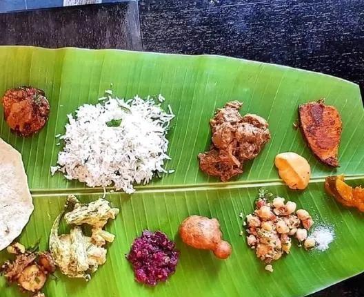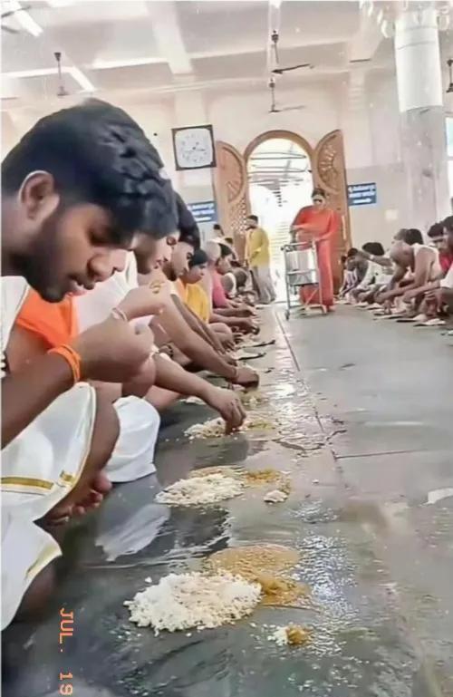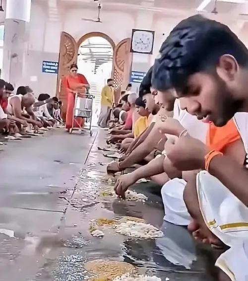 南亚国家印度民众席地而坐就餐,分别用自己的手指抓饭吃,就是食品的颜色有点诡异。