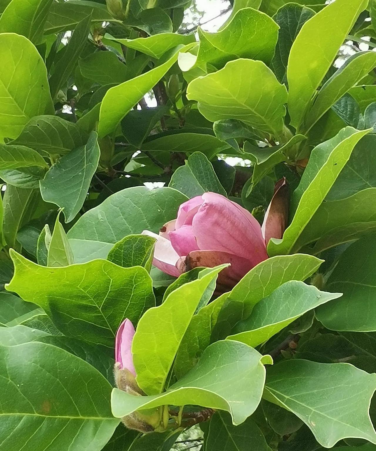 大连已经进入盛夏,今天是初伏第一天。 在大连文苑小学附近,有一排紫色玉兰树,今天竟然鲜花盛开了!这些玉兰花早春时候我就拍过,现在是夏天,怎么又开花了呢?而且,旁边还有一棵梨树已经结果子了。 真的眼见为实,这些玉兰花春天确实已经盛开过,夏季又开花了。 玉兰花一年开两次的是怎么回事? #分享城市新鲜事#