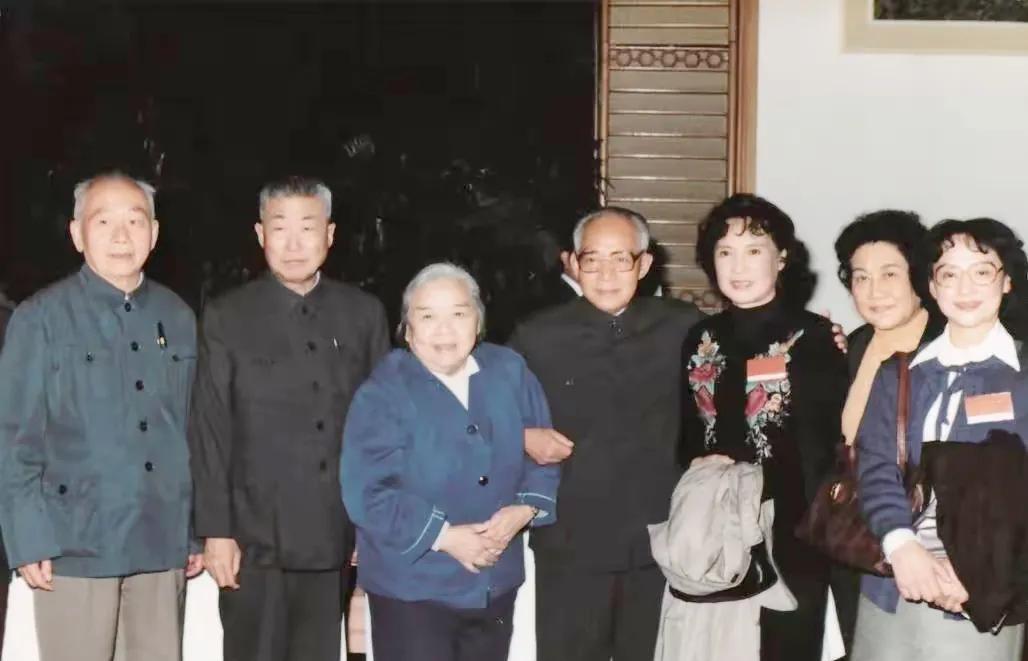 1984年春节,时任上海市委书记陈国栋同志(左二)与上海市委副书记胡立教同志(左一)陪同老领导陈丕显同志(左四)和上海文艺届著名人士吴茵同志(左三)秦怡同志(左五),张瑞芳同志(左六),王丹凤同志(右一)在一起的合影。