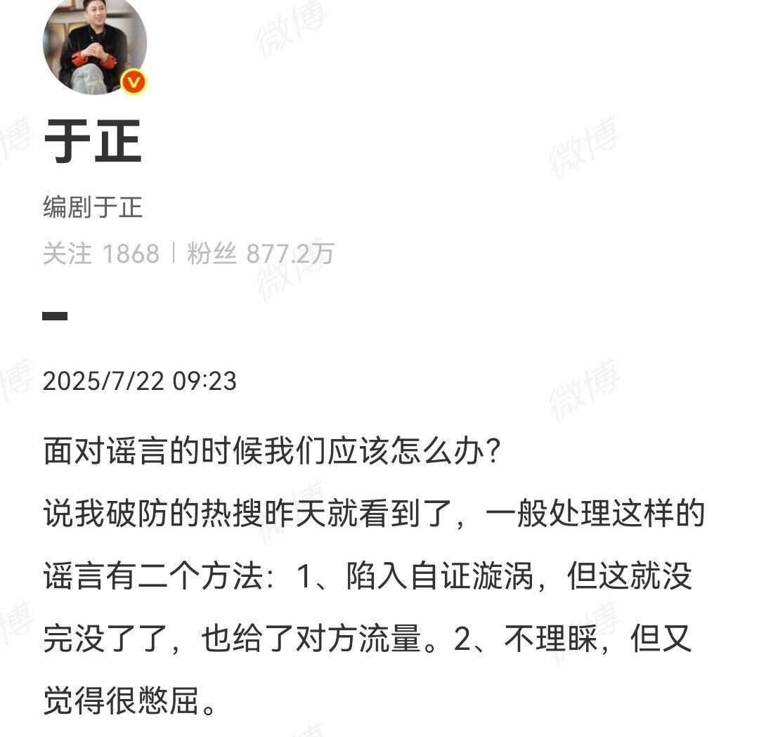 于正处理谣言的方法于正回应网友说他看话剧玩手机于正看到了说他破防的热搜