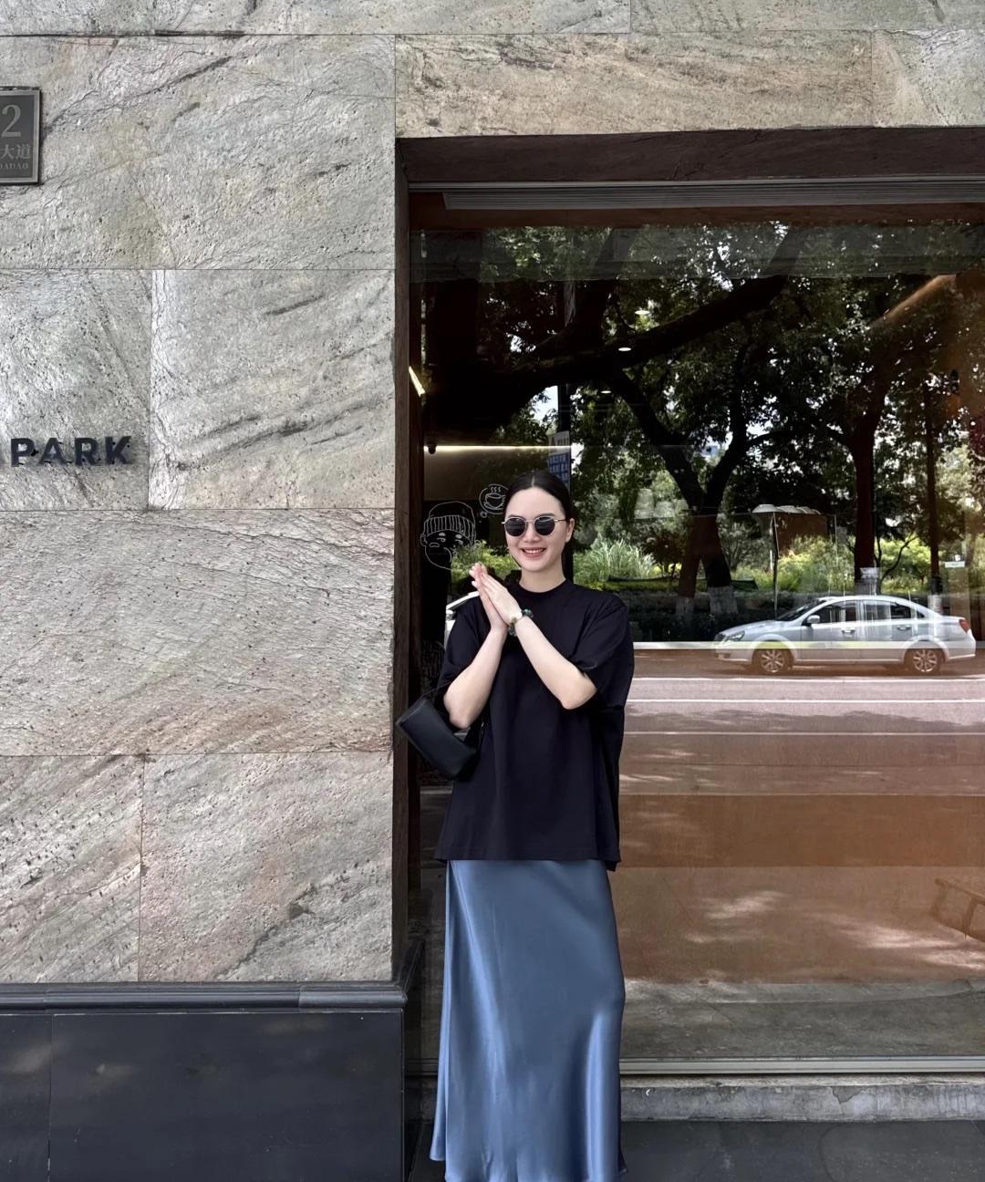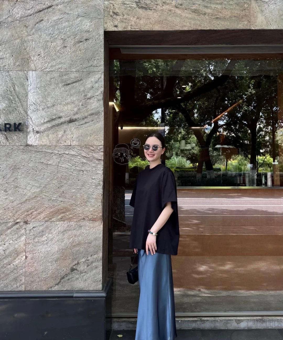 黑色T恤太无聊,可以尝试这样的穿 蓝色的断面长裙增加了精致优雅的感觉,光泽感材质