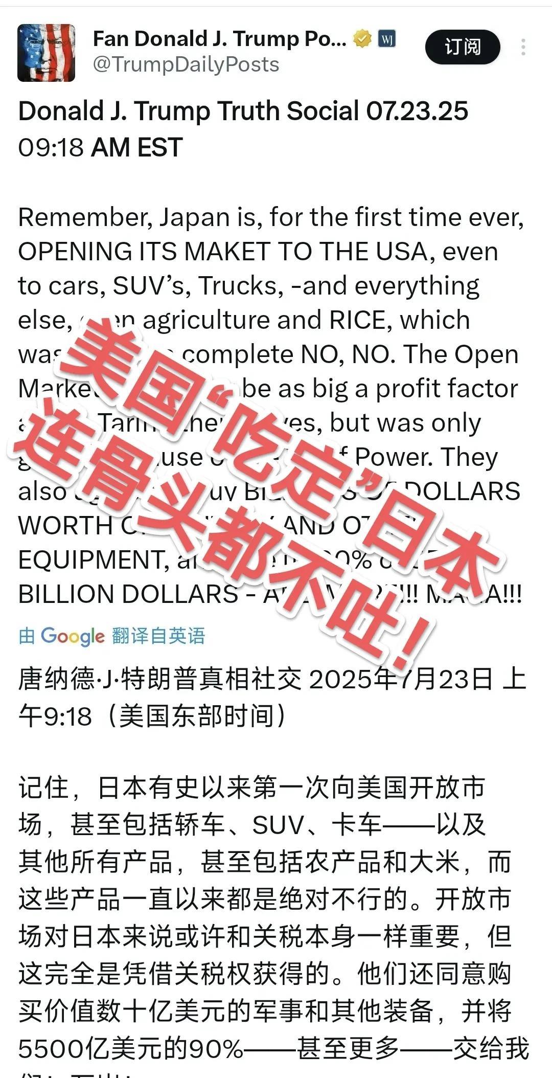 美国商务部长表示:恭喜日本用9000亿美元买到了15%的关税。变相增加100年美国对日本关税!同时15%关税附带了巨额美国对日本的条件!百年的“耻辱”呀! 日本对美国顺差每年是600亿美元,关税从25%调到15%,降低10%关税。如果日本附加9000亿美元投资,换算成关税是100年的关税。也就是美国对日本每年的关税15%再加上100年的15%关税。 所以特朗普声称史上“最大的贸易协议”,并自称为“美国胜利”! 从美国特朗普及商务部长“获胜”的感言来看,怎么看就是在“嘻笑而讽刺”的对日本的让步举措,而日本被逼无可奈何! 但从目前公布的情况来看,15%关税背后还附带了相当多的条件: 1:9000亿美元 对美投资 利润90%归日本所有!这一大笔钱估计会落入美国某些人的口袋!最终全部归美国所有! 2:美国对日本的钢 铝 关税依然为50% 3:日本将向美国开放市场,涉及汽车、卡车、大米及某些其他农产品等领域,日本还将向美国支付15%的“对等关税”。 4:美日在美国合资建成“阿拉斯加”天然气管道,日本也将投资!这个管道最终也是属于美国的! 5:日本汽车从原国2.5%上升到15%关税,已经大幅度上涨了12.5%的关税,这对日本汽车利润也是大大的压缩了空间。 6:日本已承诺购买美国制造的商用飞机,包括一项购买100架波音飞机的协议。 7:日本将立即增加75%的美国大米进口量,并大幅扩大进口配额。 8:日本将购买价值80亿美元的美国商品,包括玉米、大豆、化肥、生物乙醇和可持续航空燃料。 9:日本将向美国购买数十亿美国军事装备! 日本野村综合研究所经济学家木内登英估算,日美新协议将在一年内导致日本GDP下降0.55%。 这样的一份贸易协议,怎么看都是日本向美国“买 买 买 ”,还要帮美国数钞票,看美国人脸色. 特朗普贸易霸凌下的“得意”姿态。而日本却无力作出任何抵抗,手中确实没有“王牌”。 这是一份“不平等条约”,真像是割地 赔款的不平等条件,日本也将用额外增加100年关税的代价 为美国贡献所有财力!