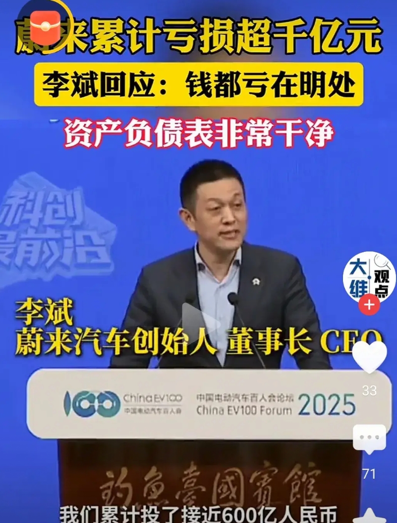 蔚来老板李斌,在网民心目中形象不太好。许多网友不喜欢他夸夸其谈,其精典语录让网友更讨厌,“特斯拉有我都有,特斯拉没有的我也有。″ “宝时捷汽车工厂,也没有我蔚来汽车厂现代"。"蔚来汽车对标BBA"等等过激语言。蔚来绝对是好车,这一点勿用置疑。只可惜网友不喜欢李老板代言自己汽车,所以蔚来汽车销量冲不上去。 蔚来价位虚高,平均车价43万多。现在汽油BBA,宝马,奔驰,奥迪。43万能买很高档BBA,中国普通家庭用车都在十几万左右。你43万一辆,明显脱离了中国汽车市场。难怪你十年亏千万,没有销售市场,出口你又不行。如果你所有车还采用高端价位,估计你在汽车界很难混下去!