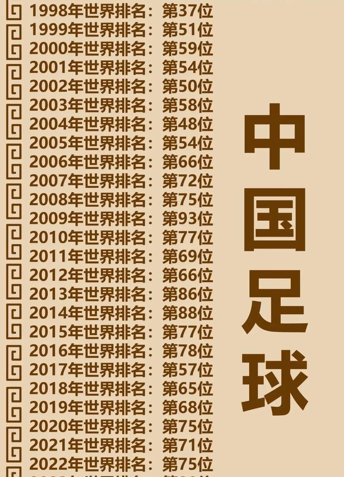 中国足球最好的成绩是1998年,世界排名37位。 最差的成绩暂时还不知道,因为随时随地都在下滑,截止2024年已经下滑到94位了。