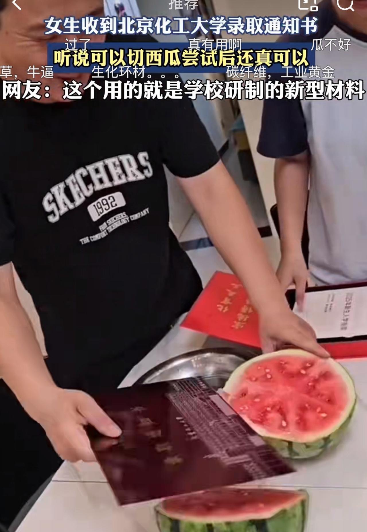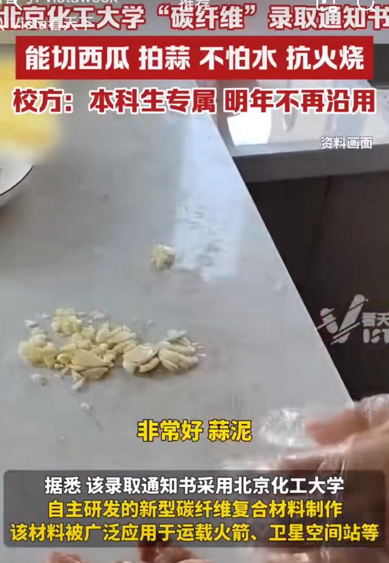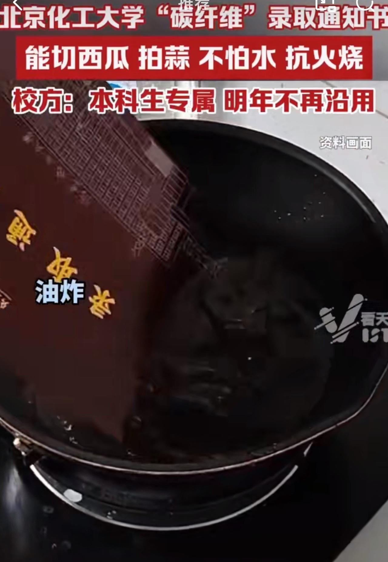 随着视频持续发酵,不少网友纷纷调侃道,“现在大学录取通知书越来越花哨了,当年就是一张纸。有一说一,纸是好纸,西瓜不熟!” 据悉,该录取通知书采用北京化工大学自主研发的新型碳纤维复合材料制作该材料被广泛应用于运载火箭、卫星空间站等。 对于这个录取通知书,北京化工大学招生办正式,这个碳纤维是今年本科生专属,明年起将不再沿用。 周少不得不说北京化工大学这录取通知书真是把“硬核”玩明白了,真的让人眼前一亮。 用自家研发能造火箭、卫星的碳纤维材料做通知书,切西瓜都没事,把科研实力藏进了这份特殊的“入学礼”里,比单纯印些花纹有诚意多了。这哪是通知书啊,简直是块“高科技铁板”。 不过,周少觉得最有意思的是网友们的花式测评,拍蒜、洗钢丝球甚至油炸,把个通知书折腾得跟实验品似的。想想以前的通知书就是张纸,现在不光是入学凭证,还成了学校科技实力的“活广告”。 除此之外,周少认为这种硬核设计不光让人眼前一亮,更暗合了学校的工科特色,让新生提前感受到科研与生活的联结。就是可惜了,这材料明年就不用了,也让今年的通知书成了“限定款”,多了份收藏意义。 对于北京化工大学这硬核录取通知书,大家怎么看呢?#长沙新朋友# #寻美三湘#