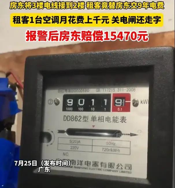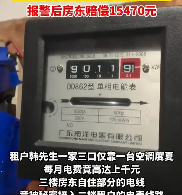 广东,韩先生称,被楼上房东私接电线偷自己的电,9年来偷了自己1.5万电费。房客说,关闭家中所有用电产品,但是电表还是走得很快,一个月就要上交一千元的电费,目前,房客韩先生已经报警。 据法治进行时7月25日报道称,最近,广东出现了这样一位无良房东,他自己私接电线,试图偷取楼下租客的电,整整九年,偷了电费有1.5万多元。 据房客韩先生称,自己真的是当了一个大大的冤大头了。特别离谱,没有想到,这样的糟心的事情,居然发生在自己身上。随着夏季的来临,韩先生就是感觉自己家的电费真的是高的离谱。 韩先生租了房东这个房子,已经有了整整九年了,房东自己住在楼上三楼,韩先生则住在楼下二楼。最艰难,韩先生就是感觉,怎么自己家的电费,就能够这么高? 这一天,韩先生突发奇想,想着就把自己家里的电源都关掉,所有的电器产品全部切断电源,然后他就走到外面去查看一下自己家里的电表。 好家伙,不看不知道,一看真的是吓一跳。电表上的数字,就跟吃了兴奋剂一样啊,不断的跳动着,简直转的不要太快啊。 看到这个,着实是给韩先生吓了一大跳,然后,赶紧去请专业的电工师傅来检查,查明白之后发现,原来是住在三楼的房东先生,将自己家的电线,给偷偷接到了他二楼租户的电线表上面来了! 这意味着什么,意味着房东家的所有用电,包括空调、冰箱、电热水器等等所有的家电开销,全部都需要租客韩先生来买单了。房东这是把韩先生当作提款机了吧,瞬间韩先生感觉自己就是冤大头。 韩先生赶紧报警了,警察出警之后,对各方面设备进行了检查,作出了责任认定书。经过协商,房东最终承认了错误,提出愿意向韩先生退还全部的电费,涉案金额一共15470元。 网友称,这种退款,对于房东的处罚力度太小了,根据法律规定,房东还需要额外进行罚款和赔款。房东就是典型的小偷小摸的行为,这属于违法行为,在法律面前,简直就是无法无天。 警方做出提示,各位租客在租房子的时候,提前对水表、电表进行拍照,记录好初始读数,并且定期观察,做到心中有数,万一有不对劲,就要及时做专业检测,并且及时报警,千万不要让不法分子钻了空子。 面对案中的韩先生,大家认为应该怎么做,才可以合理维护自己的合法权益呢? 1.房东偷自己家里的电,其行为会收到什么惩罚呢? 根据《治安管理处罚法》规定,房东偷窃自家住宅的行为,已经触发相关法规,偷电行为构成违法。电力管理部门强制要求其停止偷电行为,并且全额追缴所欠电费,同时还需要缴纳5倍以下罚款。 该行为涉嫌行政违法,会被处以5-15日行政拘留。如果偷窃的电费金额比较巨大,可能构成盗窃罪,会依法追究其刑事责任,会被处以拘役管制,并处以罚金。 本案中的房东,虽然偷盗的是自己的电线,但是不管是偷盗的是谁家的,这种就是偷窃行为,已经构成违法,同时偷窃的电费金额由房客韩某支付掉。 因此除了赔偿全部损失之外,还需要索要其他赔偿。涉案金额巨大的情况下,韩某起诉房东之后,房东还需要承担刑事责任。 2.私接电线到其他人家电表上,这样的行为涉嫌违法吗? 根据《刑法》第264条规定,未经供电企业以及电表用户同意私接电线,这种行为属于盗窃电力资源行为,构成盗窃罪。 如果偷电的金额大于等于2000元,则构成犯罪,达到了刑事立案的标准。同时,破坏用电秩序,扰乱供电安全秩序,需要承担行政责任。 很明显,该房东盗窃房客的电费,自己接通电力邪路,这就是盗窃行为,构成了盗窃罪。 其涉案金额高达1.5万,金额巨大,不仅需要全额赔偿,而且其行为因为构成犯罪,还需要被刑事立案。 从本案来看,处罚力度比较轻了,如果租客韩某继续上诉,房东将会面临法律的严惩。 网友说,偷电可耻,甚至是偷自家租客的电,更可耻。面对房东的这种行为,您作何感谢呢,欢迎大家一起来讨论吧。#头号创作者激励计划##分享城市新鲜事#