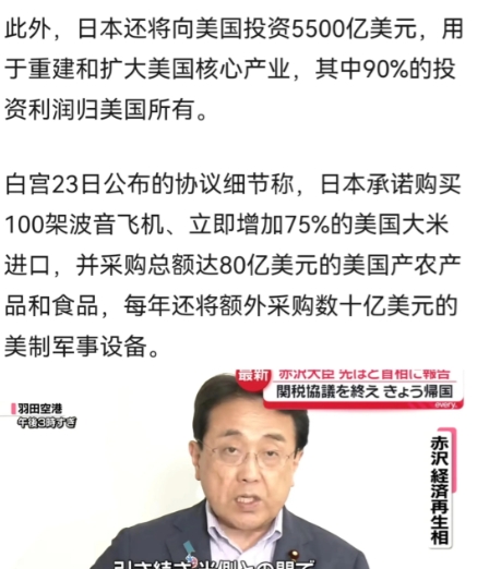 日本也有今天,和美国签订了“不平等条约”,我记得以前中国在清朝时期签订很多屈辱的不平等条约。日本还逼着中国签订马关条约,当然,那段屈辱历史一去不复返了,天道好轮回,现在轮到日本。 日本一次性就缴纳“保护费”5500亿美元,然后开放农业,每年定期购买飞机、军事装备等,只不过换来15%汽车关税,至于购买美国钢铁企业,提都没资格提,给的美元足以拯救美国企业。 二战让日本变成二等国,从此没有机会,现在只是延续。最好老实点,不然,恐怕经济面临更大绝境。