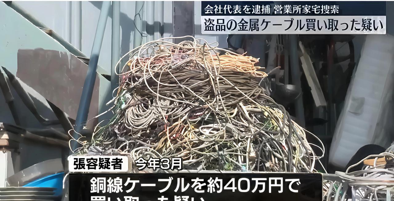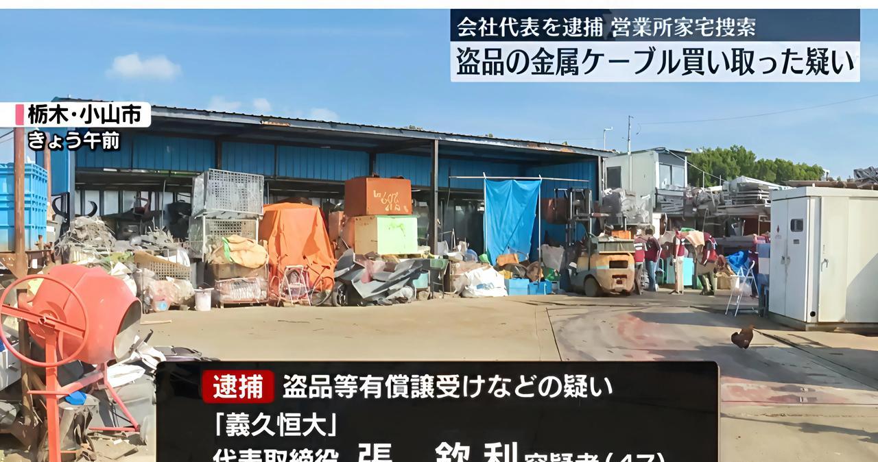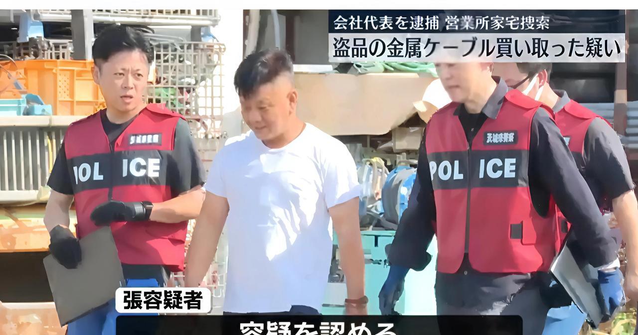 日本警方逮捕一涉嫌收赃 的中国人 7月28日日媒报道,一名东京的中国籍金属回收公司法人,因收购被盗电缆被捕。 据警方透露,废金属回收公司“义久恒大”的法人中国籍張欽利(47岁),涉嫌于今年3月,在明知是茨城县一家太阳能电站被盗电缆情况下,仍然以40万日元(约19000元人民币)的价格收购赃物。 7月28日,警方搜查了该公司位于栃木县的营业所。 嫌疑人张欽利在回应调查时承认了指控,警方认为他还涉案其它被盗金属。