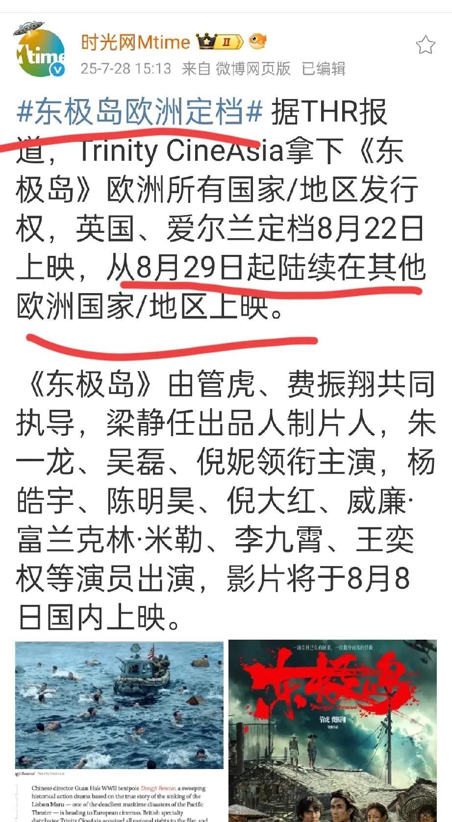 #东极岛欧洲定档# 继澳大利亚(8.14日),美国(8.22日),英国(8.2