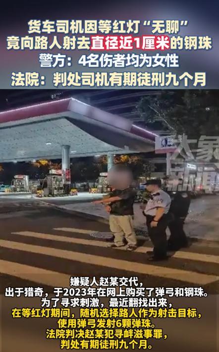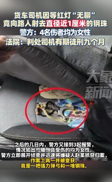 这是在害命!杭州街头,一女子等红灯时突然手臂剧痛,低头一看竟是被钢珠射中,血流不止!更离谱的是,几天内接连有人报警,皆是同样遭遇,直到警方顺藤摸瓜查到一辆小货车,才揭开真相:司机因等红灯太无聊,竟拿弹弓朝人发射钢珠“解闷”!网友:判太轻了! 根据大象新闻7月28日的视频,这天一女子约着朋友一起出门,就在二人等红灯准备过马路的时候,她突然感觉自己的手臂一阵刺痛。 起初她以为是被什么虫子咬了,但是低头一看,她的手臂上竟然出现了一个圆形的伤口,周围也已经破皮,正慢慢渗着血。 朋友下意识的环顾四周,果然在不远处的地面上,发现了一颗大约1厘米的钢珠,她捡起来一掂量,钢珠十分沉重,打到身上确实不轻。 两人立马意识到应该是有人发射弹弓伤了女子,就想着找到对方,但是寻找一番依旧没有线索,两人无奈选择了报警。 警察记录境况后表示,一有线索就会联系她们,建议女子先处理一下伤口。 然而在之后的三天内,奇怪的事情发生了,警局接连接到几起类似的案件,伤口形状和女子如出一辙,而且受害者都为女子,这立马引起了警方的注意。 经过几天的侦查和蹲守,警方终于锁定了犯罪嫌疑人,那是一名中年男子,开着一辆小货车,警方迅速进行抓捕,果然在其车上发现了一把强力弹弓和一堆钢珠,就是女子捡到的钢珠。 面对铁证和警方的询问,男子承认这些东西是在两年前出于好奇买的,近段时间因为开车太无聊,为了寻找刺激,所以才翻了出来。 他每次就在在等红灯的时候,随机寻找路人作为目标,一完成发射,就迅速回到车里躲避,一共发出六颗弹珠,都没有被发现。 最终法院认为,男子涉嫌寻衅滋事,被判处有期徒刑九个月。 事情一出,网友纷纷表示,等红灯无聊就打人,那是不是饿了还能抢劫超市? 也有网友表示,九个月太轻了,这是故意伤人,主观故意,未来只要有机会,他还会干坏事,骨子里就坏! 对于这件事,大家有什么想法呢?欢迎在下方一起留言讨论!