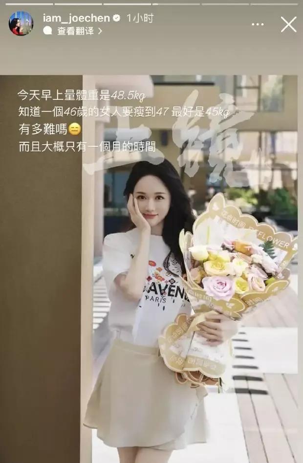陈乔恩称要一个月瘦到45公斤:早上量体重时已瘦到48.5公斤。 7月29日,陈乔恩在社媒透露“早上量体重时已经瘦到48.5公斤。知道一个46岁的女人要瘦到47公斤,最好是45公斤有多难吗?而且大概只有一个月的时间。”