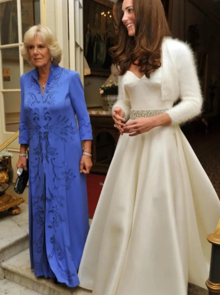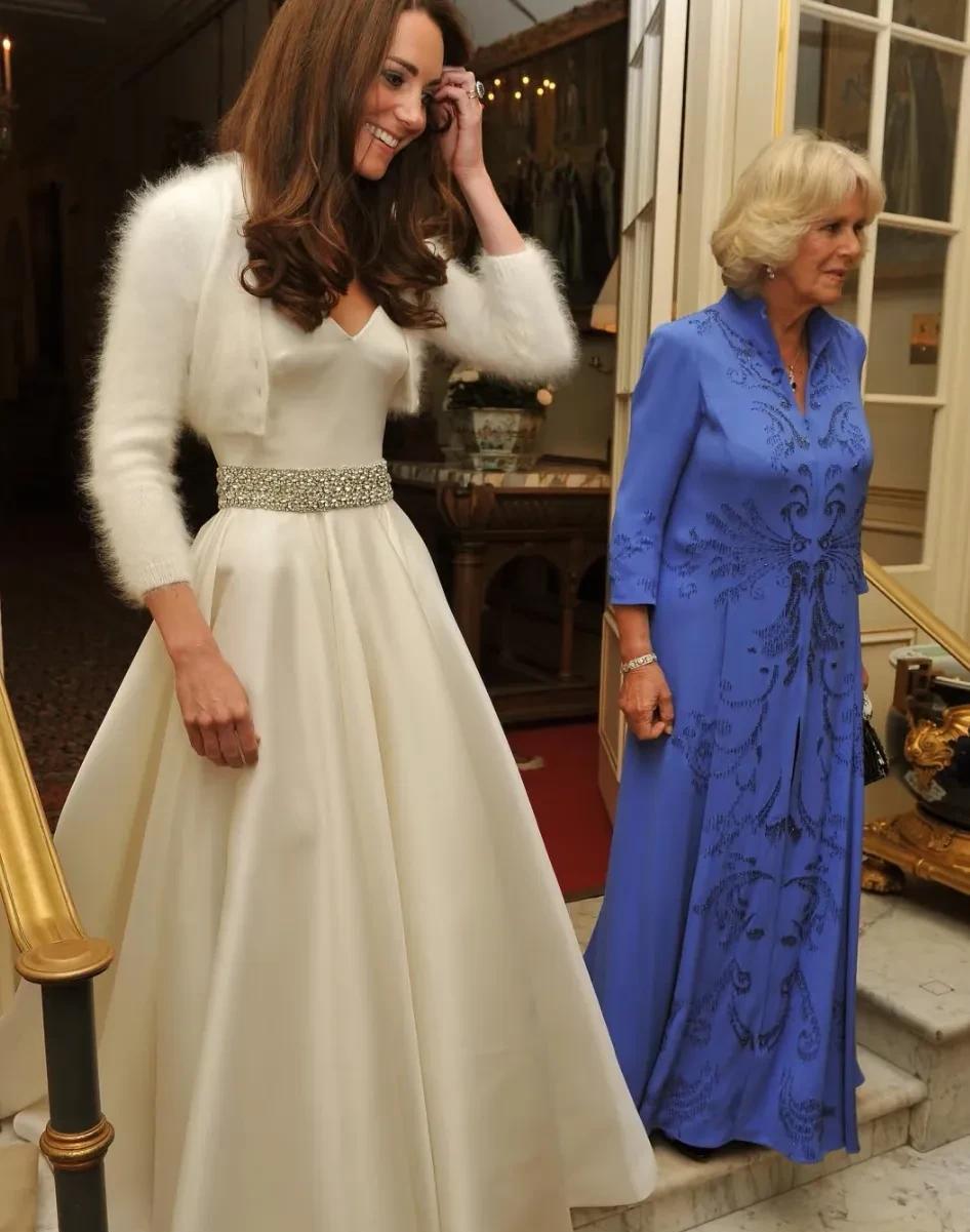 2011 年凯特王妃与威廉王子大婚典礼上,由Alexander 创意总监打造的第二套婚纱仅在当晚王室的私人晚宴上亮相,见证了凯特王妃另一种风情。为了搭配这件礼服,凯特王妃还披上了一件白色安哥拉毛短款开衫。胸部两件婚纱礼服都是这种尖头设计,可能是我个人的审美吧,不太喜欢这样的设计,当时媒体照片还有新闻报出来,好多人以为凯特不小心走光了。