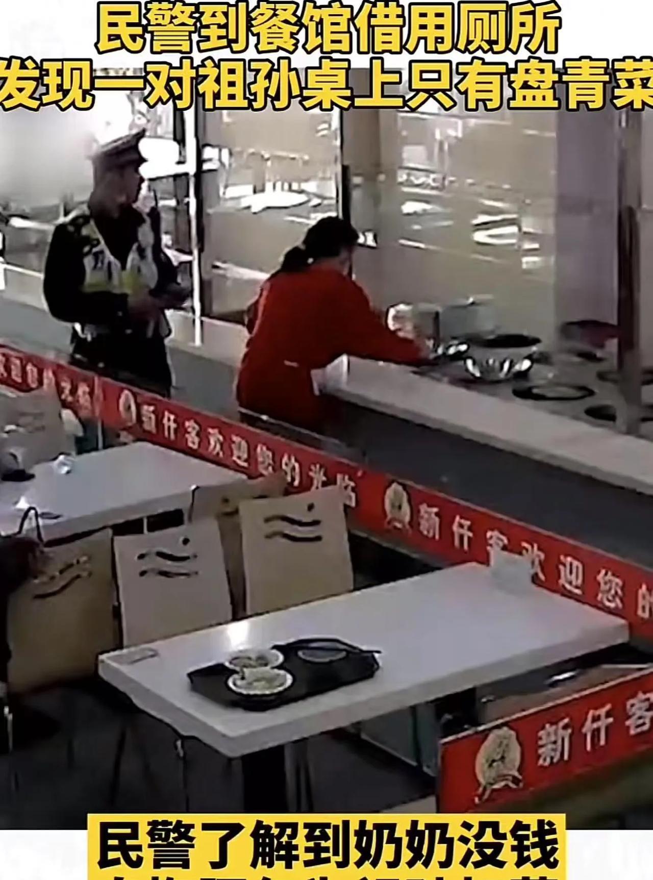 这个民警太暖了!民警到餐馆借用厕所,看到一对祖孙桌上只有一盘青菜。民警忍不住问老