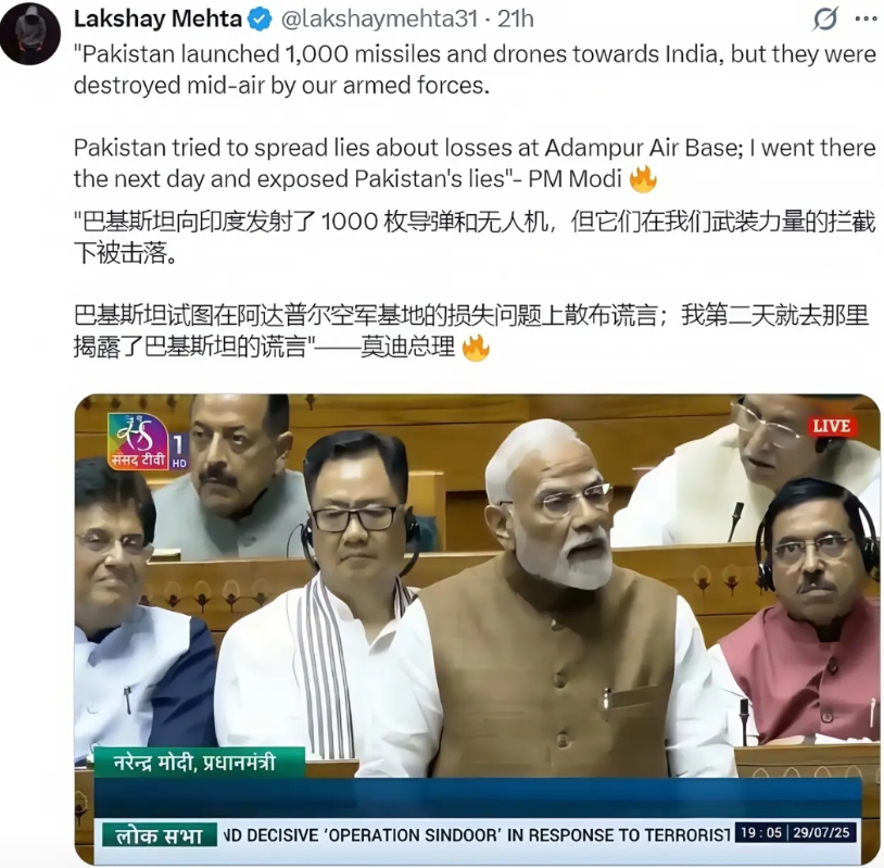 印度又赢了!印度总理莫迪在国会发言中称:印度军队在近期与巴基斯坦的紧张对峙中,成功拦截并摧毁了1000枚巴基斯坦的导弹和无人机。