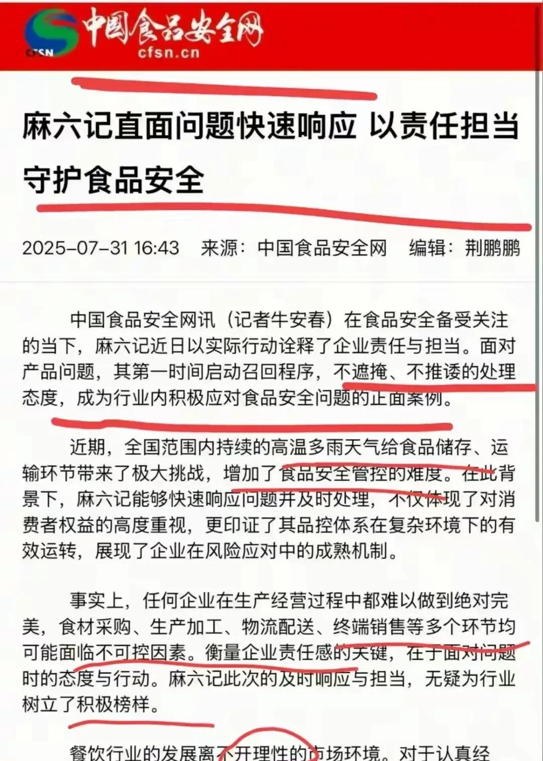 汪小菲这次的难关总算渡过去了!关于酸辣粉湿粉发霉问题,中国食品安全网为麻六记发声,称麻六记是有责任与担当的企业,出现问题,第一时间解决,不遮掩逃避,也非常理解因气候原因给食品储存带来的风险,希望社会各界理解与支持,民族品牌才有更广阔的成长空间,总之,食品安全网都出面支持力挺,相信汪小菲他们也一定是认识错误态度诚恳,这次也算一次教训! 讲真,人无完人孰能无过,人家直播的时候也说过不满意,出现问题都会退换解决,很明显,就是汪小菲名气太大,黑宝宝也太多,一有事就一窝蜂的上,不过,这样也好,有人监督,消费者更放心吧![呲牙]