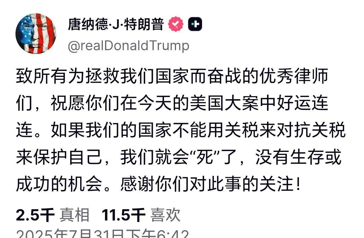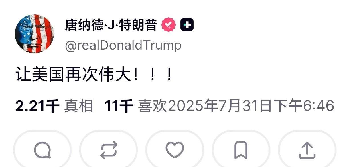 关税新政前的最后一天,特朗普连发三文,歌颂他的关税政策:关税政策救了美国,并会富强伟大美国! 特朗普的自炫还是有些根据的。特朗普借助关税这个工具,正在改变美国改变世界,甚至可以说,正在重构美国重构世界,作为一个商人总统,他更谙于此道。设想当初若是哈里斯被选上来,哈里斯会玩关税这个工具吗?会玩得像特朗普这样得心应手吗?所以特朗普说特朗普还是有两把刷子的。 特朗普非常聪明地抓住了主场(经济与政治无与伦比的影响力)这个优势,以主动(主人公)地位安排着这个世界与各国家的席次。 8月1日起,世界将进入特朗普关税新政时代,而且关税是动态的,调整权攥在特朗普手里。