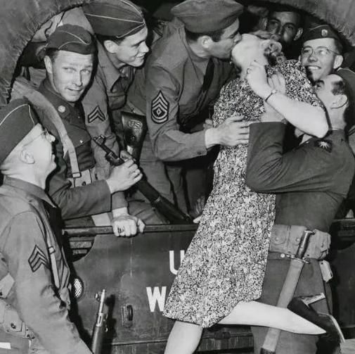 1940年代,一名士兵举起一名年轻的女人,将她送给卡车上的大兵。这名大兵不但亲吻她的嘴唇,甚至将手放在了她的腰间,这名女子不是车上那名大兵的情人,也不是风尘女子。她叫玛莎·奥德里斯科尔 ,是好莱坞的一名当红女演员。 那天,烈日炙烤着加州圣安娜基地,空气中弥漫着卡车尾气和士兵制服上汗渍的味道。 玛莎·奥德里斯科尔身着一袭宝蓝色绸缎长裙,站在临时搭建的露天舞台上,刚刚结束了一场劳军演出。 她的卷发被汗水打湿,贴在额角,嗓音因连续演唱而略显沙哑,但她依旧微笑着和士兵们互动。士兵们穿着卡其布制服,戴着船形帽,挤在台下,眼神里满是对家和未来的渴望。 演出结束后,按照劳军联合组织(USO)的惯例,玛莎要送别这些即将奔赴战场的年轻人。她走到卡车旁,士兵们争先恐后地伸出手,只为和这位银幕上的“天使”握一下手。 就在这时,水兵梅恩·塞弗里德突然大喊:“玛莎,给你个惊喜!”他一把托起玛莎,纤细的腰肢在他手中仿佛易碎的瓷器,周围士兵哄笑一片。 空军一等兵罗伯特·莱布塔趁势凑上前,在玛莎脸颊上轻轻一吻。玛莎先是一愣,随即露出羞涩的笑容,高跟鞋悬空晃荡,蓝色裙摆在灰绿色的军营背景下格外刺眼。 士兵们齐声喊着:“再来一个,罗伯特!”引擎声、口哨声、笑声混杂在一起,成了战火前夕最温暖的画面。 这一吻,被战地摄影师拍下,登上了《生活》杂志封面,迅速传遍美国。它不仅象征着士兵们对胜利的渴望,也成了玛莎·奥德里斯科尔战时劳军生涯的高光时刻。但谁能想到,这张照片背后,藏着她内心的挣扎与士兵们的生死离别? 回到那天晚上,玛莎回到临时驻地,卸下妆容,坐在简陋的化妆镜前,盯着自己的脸发呆。白天士兵们的欢呼还在耳边回响,但她的心却像被掏空了一般。 她在日记中写道:“当我看到自己被千万人注视时,我颤抖了一整夜……这真的是在帮助和平吗?” 作为好莱坞黄金时代的签约演员,玛莎从1930年代起就活跃在银幕上,代表作《海上恋舞》让她成为家喻户晓的女星。 但二战爆发后,她的生活被彻底改变。珍珠港事件后,美国劳军联合组织(USO)号召明星参与巡回演出,玛莎主动报名,带着5箱华服,奔波于各个军营。 她知道,自己的歌声和笑容能短暂抚慰士兵们的心,但她也清楚,这种“慰藉”背后,是战争对人性的无情碾压。 更让玛莎不安的是,公众对她的行为褒贬不一。1944年,《纽约先驱论坛报》刊登读者来信,质疑她“被陌生男人搂腰亲吻,是否在鼓励轻浮?”这些声音像针一样刺痛她。 她开始怀疑,自己到底是士兵们的“天使”,还是被战争机器征用的“符号”?然而,军方的态度却截然相反。 一份解密文件显示,陆军部认为:“一张照片提升的士气,胜过十场训话。”玛莎夹在两种声音之间,内心矛盾愈发激烈。 “胜利之吻”照片中的士兵罗伯特·莱布塔,只有19岁。那天,他吻玛莎时,脸上挂着腼腆的笑,眼神却透着对未来的迷茫。 玛莎后来回忆,她能感觉到罗伯特的手在微微颤抖,仿佛在用这一吻抓住生命中最后的光亮。 仅仅7个月后,1945年3月,罗伯特在冲绳战役中战死,年仅20岁。他的名字被刻在加州的一块纪念碑上,照片中的笑容成了永恒。 而托举玛莎的水兵梅恩·塞弗里德,幸运地活到了战后。2010年,他接受采访时回忆:“玛莎的腰肢比想象中纤细,我托着她像托着一只易碎的瓷器。那一刻,我们都忘了战争,只想抓住一点温暖。” 梅恩的回忆,让人感慨战争中人性的脆弱与坚韧。那张照片,不仅是玛莎的符号,也是无数士兵短暂生命中的一抹亮色。 战争结束后,玛莎没有继续沉浸在好莱坞的光环中。1948年,她选择退出影坛,成立“艺术家和平联盟”,投身战后儿童慈善事业。 她走遍欧洲的难民营,为失去父母的孩子筹集物资,用自己的方式弥补战争的创伤。1951年,杜鲁门总统亲自为她颁发铜星和平勋章,表彰她对和平的贡献。 晚年的玛莎回想起1944年的那一吻,脸上总带着复杂的表情。她曾对友人说:“那一吻是战争的一部分,它让我看到人性最美好和最残酷的两面。 我无法改变过去,但我可以选择未来。”她的选择,是对战争最大的反思——和平从来不是理所当然,而是无数人用生命和泪水换来的。 信源:(趣历史网二战珍贵照片 美国二战时亲赴前线劳军的女星.2014-03-14.)