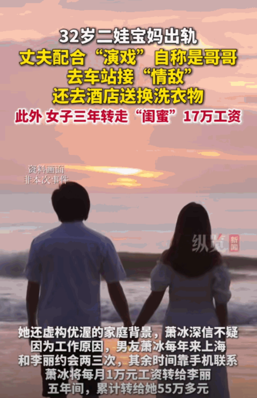 “太荒唐了!”上海,一女子婚后生下双胞胎儿子后出轨,每年和小自己2岁的情人在酒店约会三次,丈夫不但知道,还以女子“哥哥”的身份,开车去车站接情敌,去酒店给女子送换洗衣服,情人5年内给女子转账55万元,还给她贷款买的车还月供,却不知道“大舅哥”其实就是女子丈夫,丈夫为啥愿意甘愿戴绿帽子?他一番话惊呆众人。   据媒体7月31日报道,故事的主角名叫李丽,2018年她与丈夫步入婚姻的殿堂,很快就生下了一对双胞胎儿子。   本来两人以为正朝着幸福走去,可随着时间的推移,夫妻间的矛盾不断,争吵逐渐变成家常便饭,两人的感情也在着一次次的冲突和争吵中消磨殆尽,家里只剩一个披着幸福的空壳。   2019年底,生活的不顺心让李丽想在网络世界中寻求安慰,她在社交平台上认识了比她小两岁的萧先生。   李丽为了能和萧先生能够继续往下发展关系,精心编造了一个虚假身份,她对萧先生说自己是98年的,而且还没结婚,萧先生听到后很快被李丽的个人形象所吸引,陷入了这段虚拟的爱情中。   由于萧先生的工作在外地,两人只能在网络上维持联系,每年萧先生还会来上海与李丽约会三次。   尽管时间有限,但是萧先生对李丽那是全心全意,每个月还会把自己的1万元工资全部转给她,这五年期间,转账金额高达55万元,甚至还主动承担李丽贷款买车的月供,只为了能他让她生活更好。   而李丽的丈夫冯骏在这场恋爱里,扮演了一个让人震惊的角色,他明明知道妻子已经出轨,但是他没有选择离婚,而是全力配合妻子。   萧先生每次来上海,冯飞骏都会开车前往车站去迎接这位“情敌”,之后还以李丽哥哥的身份和萧先生向何处,更让人不理解的是,每当萧先生和李丽在酒店约会的时候,冯飞骏还会贴心的给妻子送去换洗衣服。   纸终究包不住火,李丽持续了长达五年之久的骗局,因为欺骗另一个人的全部败露。   2021年李丽在公司认识了同事王女士(化名),两人很快就成为了闺蜜,但李丽并没有真正把王女士当做好朋友。   经过长时间的交往,李丽逐渐将罪恶的手伸向最信任她的王女士,李丽通过借口得到了王女士的支付密码,从2021年到2023年期间,李丽通过小额多次转账的方式,悄无声息的转走了王女士的17万元积蓄。   直到王女士的方通催交房租的时候,王女士才发现自己工资卡上只剩下10元,自己不敢相信最好的朋友会偷走他的钱,王女士的丈夫得知后立马选择报警,警方在调查的过程中,一意外揭开了李丽出轨并诈骗萧先生的整个真相。   当警察找到萧先生后,这才如梦初醒,他怎么也想不到自己深爱并且毫无保留的女友,竟然是有丈夫的人,而一直对他热情招待的“大舅哥”竟然就是他深爱着的女友。   这件案件经过媒体报道后瞬间引发热议,有网友评论:“不是一家人不进一家门,老公心甘情愿吃软饭,还吃的理所应当。”   还有网友评论:“这算不算仙人跳?都是共同诈骗罪,目的就是骗财。”   在婚姻里,如果感情出现问题,就要及时沟通,理性解决才是正确的做法,老话说床头吵架床位和,总能回到做好的状态,不能像李丽和冯飞骏这样,选择用令人震惊的方式来维持一个即将破碎的家。