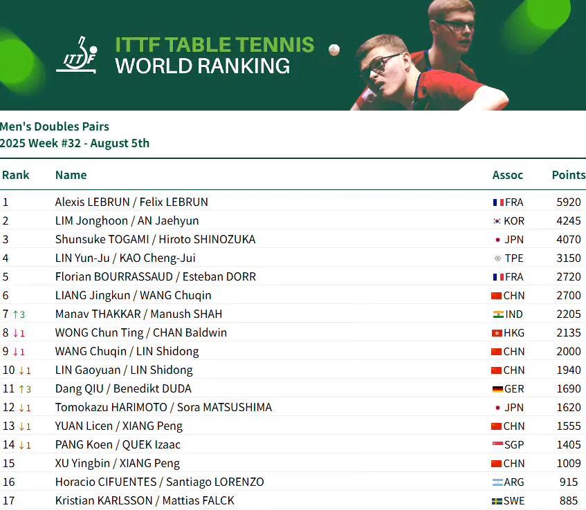 世界排名更新,意外的不是雨果冲到世界世界第三,而是国乒男双无缘前五! 男双王楚钦/梁靖崑是国内排名最高的男双,也只能排在第六,王楚钦/林诗栋第九,前五被外协包了,法国两对男双在前五,勒布伦兄弟牢牢锁住榜首。印度男双进步非常快,已经排名第七,对王楚钦/梁靖崑展开追赶了。 国乒男双在亚锦赛滑铁卢,制造历史最差成绩。世乒赛全军覆没,五十年最差战绩。美国大满贯,男双无缘决赛。国乒男双集体疲软半年了,还在试错。国乒教练组还有招吗?
