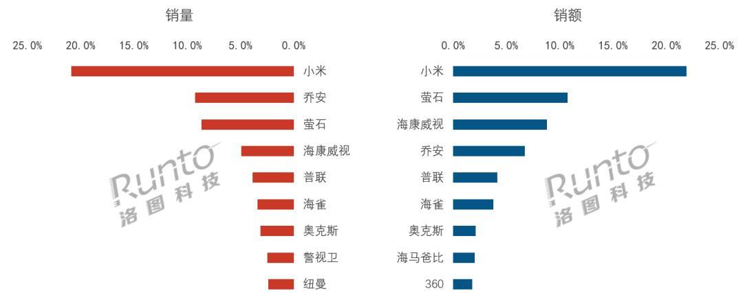 洛图科技发上半年国内监控摄像头数据 1、2025上半年国内监控摄像头全渠道销量为2796万台,同比增长0.2%,销售额为55.6亿元,同比下降0.9%; 2、监控摄像头是以线上销量为主的,这个渠道销量占比已经超过60%。且同比增长10.9个百分点; 3、线上销量排名第一的是小米,排名第二的是乔安,接下来是萤石,海康威。这四个品牌占比达到43.7%。在线上销售额排名第一的也是小米。 PS:没想到吧!在监控摄像头领域小米也这么牛!