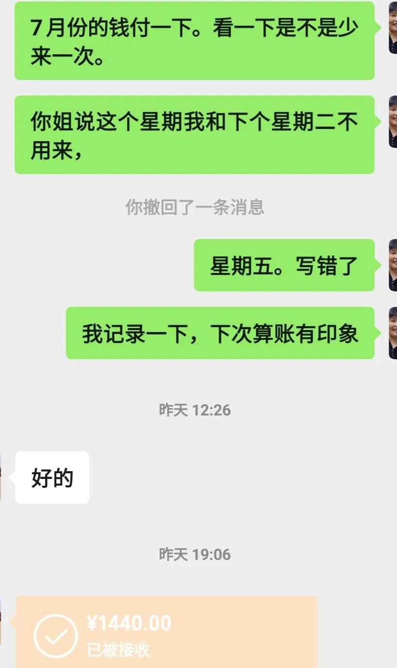 我是不是有点太着急了呢?我就爱钱。[大笑] 我是做家政的大姐,昨天是8月6日,我客户7月的工钱还没付给我。我这人啊就爱钱,干完活就想收到钱。 昨天去他家打扫卫生,客户比较忙不在家,他姐姐常年住在他家。 我像平常一样,一大早就赶到客户家,放下工具包就开始干活。 先从房间开始,整理一下床铺,用除尘纸把枕头底下的头发吸附掉,再把床单上的皮屑擦一擦。 按照从上到下、从里到外的顺序擦拭,主卧打扫好后,顺便把主卧的卫生间也打扫出来。 下面的图片看一下,我擦的干净透亮吗[大笑] 油烟机的油盒,每次拿下来清洗,倒点厨房氧净,用热水泡一下,然后用纸巾擦一擦。 在他们家打扫一次需要一上午,收费180元,一周打扫两次。 他家房子面积比较大,不过打扫得勤快,还是比较好收拾的。 打扫完,正准备出门的时候,客户的姐姐叫了我一声。 她说:“阿姨,你这周五和下周二就不用过来了,我们要出门旅游去。” 我说:“好的,提前告诉我挺好的,这样我有空也能去安排临时的客户。” 下楼坐电梯的时候,我给客户发了个消息,把他姐姐说的话告诉了他。 我主要是想在手机里留个记录,这样到月底结账的时候能有个印象。 因为我打扫卫生是按次收费的,一个月去多少次就结算多少钱,没去就没有工钱。 我还顺便跟他说了,把7月的工钱结一下。 大家说说,我这是不是有点太心急了,我觉得这是我应得的劳动报酬啊。你们说是不是呢?[大笑]