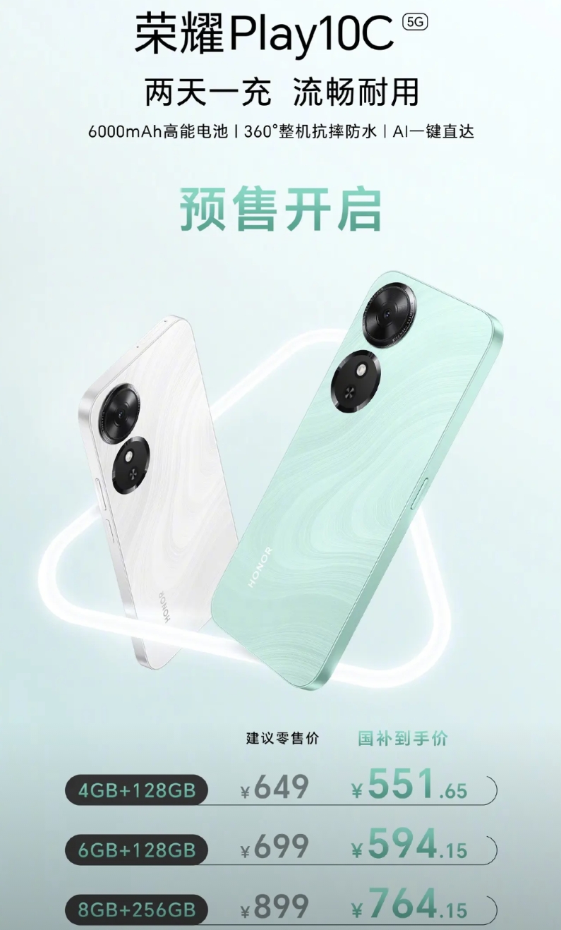荣耀Play 10C发布 4+128GB 649;国补551.65 6+128GB 699;国补594.15 8+256GB 899;国补764.15 天玑6300处理器,6.61英寸720p屏幕,6000毫安时电池,+15W,前置500万+后置1300万镜头,单扬声器,侧边指纹