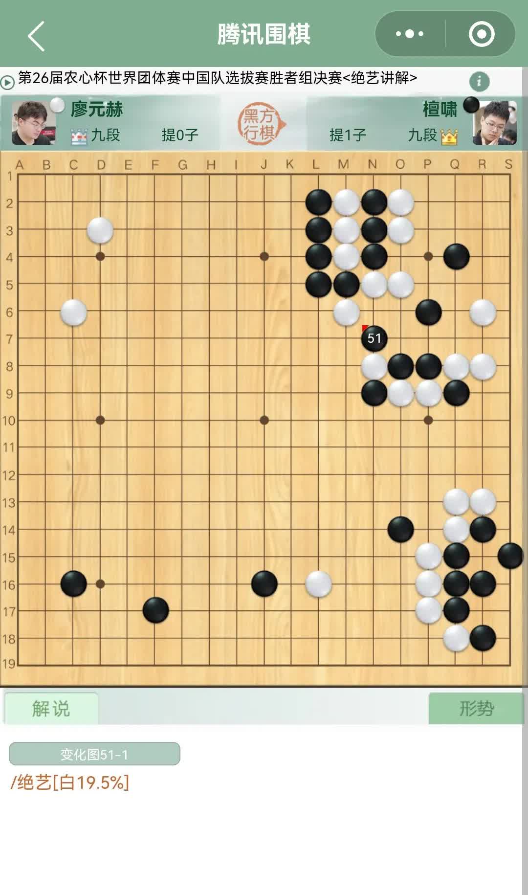 第26届农心杯世界围棋团体体赛中国队选拔赛胜者组第四轮比赛正在进行,很难想象昨天将悍将屠晓宇九段杀的溃不成军的廖元赫九段,面对年过三十的檀啸九段两度被接龙! 执黑的檀啸九段以对角小目开局,廖元赫九段应以对角星小目,双方旨在将局面引入激战! 黑51打,至黑59,檀啸九段早早将廖元赫九段打成接龙! 白94虎时白棋胜率有所回升,达到23.5%,然而区区数手之后,黑99虎,檀啸九段再次将廖元赫九段打成接龙! 目前双方下至黑145,白棋胜率依然是个位数,看来檀啸九段将喜提农心杯中国队首张选拔入场券,棋友们也非常期盼檀啸九段重演北海杯轻松拿捏申真谞九段的精彩画面!加油!
