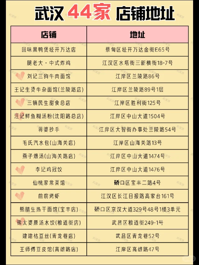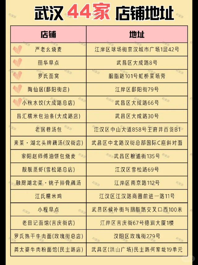 武汉的人间烟火里,过早一定是它的美食主编。毕竟在武汉,有过早的地方,就有江湖,就是烟火人间 今年春天我又一次从武汉吃回来,说真的,在这里的每一顿都让我挑花了眼,吃撑了胃,反复横跳,就是舍不得离开那一条条让人兴奋的美食街巷 🔹🔹🔹 这次我🍜整理了4⃣️5⃣️种武汉美食,95%是我亲测,5%是和本地人闲聊知道的 如果你正打算去武汉尝一口过早的人间烟火气,这里万食俱备🌟记得收藏 🔹🔹🔹 ⭕云集美食宝藏街 答应我❌不要为了吃去户部巷,好么? 武汉的美食街巷✅双手+双脚都数不过来,尤其是过早,粮道街、吉庆街都不够烟火气,下面这8⃣️条才是武汉人奔赴生活的起始点 📍山海关路、胭脂路、一元路、大成路、瑞安街、兰陵路、宝裕路、玫瑰街 🔹🔹🔹 🍜江岸区美食 📍刘记三狗牛肉面馆📍蒋婆抄手📍王记生烫牛杂面馆 📍三镇民生甜食总店📍汪记鲜鱼糊汤粉总店 📍燕子煨汤📍毛氏汽水包📍李记鸡冠饺📍陶仙居 📍双黄牛肉面馆📍徐氏糯米包油条📍王师傅豆皮馆 📍严老幺烧麦📍老田记面馆📍淘气牛杂馆📍德华楼 📍一品红牛肉面馆📍武昌重油烧梅店总店 📍一元路怪味烧饼📍袁大头包子📍郑记牛肉面 📍融厨湖北菜 🔹🔹🔹 🍜武昌区美食 📍建建枯豆丝📍罗氏面窝📍小程早点 📍袁氏米粑发糕📍龚太婆牛肉粉面馆📍来菜 📍昌汇糯米包油条📍小秋水饺总店📍丽华早点 📍熊太婆原汤水饺📍家阳赵师傅油饼包烧麦 🔹🔹🔹 🍜其它区美食 📍回味黑鸭煲经开万达店📍仙桃家常菜馆 📍腿老大·中式炸鸡📍熊腊生热干面馆📍七七饺子 📍前前烤虾📍老居巷汤包📍靓靓蒸虾总店📍江氏糯米鸡📍罗氏热干牛肉面总店📍江汉路煎包一绝 🔹🔹🔹 武汉人的过早,对我来说,那就是从早过到晚,一个月不重样不是骗人的。天生江湖豪情的他们,吃的是烟火,品的是人间 💟我是莉漫游,跟着我追逐风味的脚步,跨越山海之间,看尽红尘万千,邂逅漫游奇遇