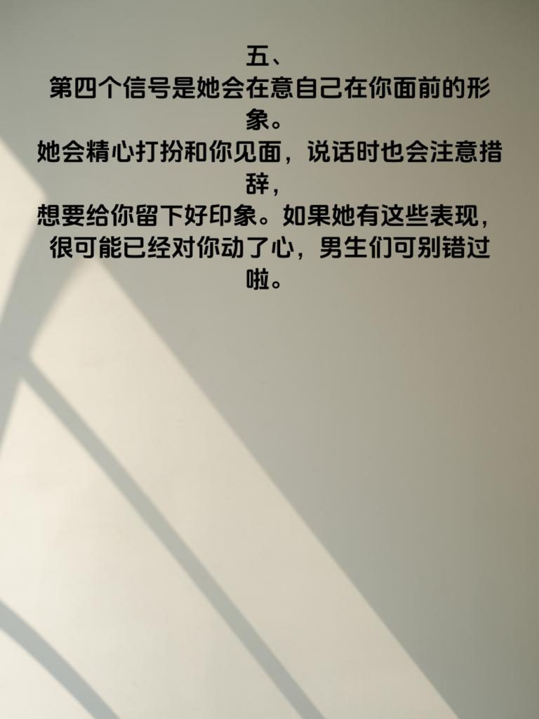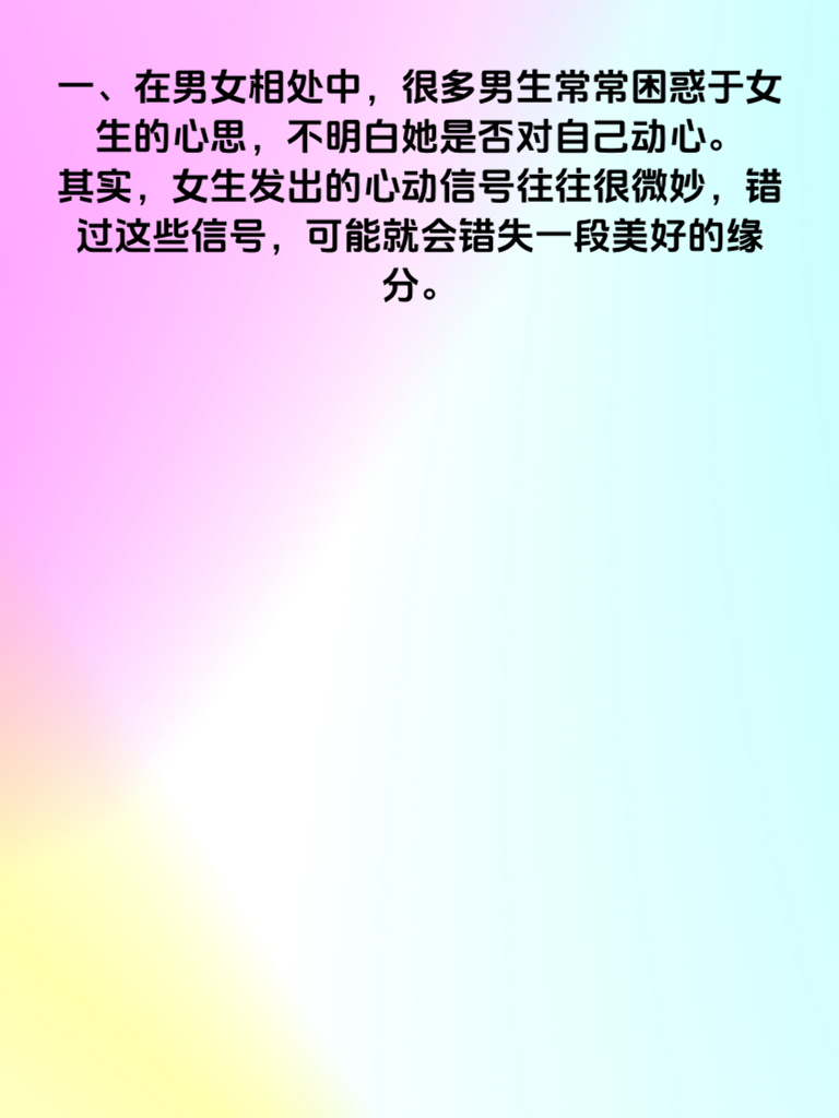 一、在男女相处中,很多男生常常困惑于女生的心思,不明白她是否对自己动心。其实,女生发出的心动信号往往很微妙,错过这些信号,可能就会错失一段美好的缘分。 二、第一个信号是她对你的话题很感兴趣。当你和她聊天时,如果她总是积极回应,眼神专注,甚至会主动延伸话题,这说明她很在乎和你交流,内心对你有一定的好感。比如,你分享工作中的趣事,她会追问细节,还给出自己的看法,这就是很好的迹象。 三、第二个信号是她会关心你的生活。她会留意你说过的事情,比如你生病时,她会主动询问病情,叮嘱你吃药休息。或者在天气变化时,提醒你增减衣物,这种贴心的关怀,往往是心动的表现。 四、第三个信号是她愿意和你有更多的身体接触。比如走路时不经意地靠近你,一起坐着时会轻轻触碰你的手臂等。这些看似不经意的动作,其实是她内心渴望与你亲近的反映。 五、第四个信号是她会在意自己在你面前的形象。她会精心打扮和你见面,说话时也会注意措辞,想要给你留下好印象。如果她有这些表现,很可能已经对你动了心,男生们可别错过啦。