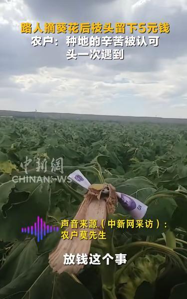 太讲究了!新疆塔城,一农户发现,自家葵花田里少了一朵葵花,刚开始他以为遭了小偷,不料,他发现被折断的枝头上面竟绑着5块钱,农户看后瞬间明白了原由,内心十分感动。网友表示:这是对农民的尊重! 莫先生在年轻的时候也像绝大多数人一样,远在家乡在外给别人打工,但干了几年之后他觉得给别人打工很不自在,所以他就想回到自己的家乡干出一番自己的事业。 回到家之后他一直没有想到自己要干什么,后来他灵机一动想到了种向日葵,正好他这边的土地适合,所以他就开始了种向日葵。 刚开始的时候就只是在自己家的地种了一些,慢慢的发现种向日葵也很挣钱,随后他便承包了很多亩地然后准们种植向日葵。 近日马上就到了向日葵丰收的季节了,于是他经常会去地里面查看向日葵的近况,因为越是到丰收的时候越要小心。 有些人们知道现在的向日葵就能吃,偷摸摸的就会给他拔了,之前的时候老莫就遇见过这样的事情,所以他现在格外小心。 不料近日他进去检查的时候就看到一个向日葵被人偷了,起初的时候他很是生气,但是走到近处一看,这个向日葵的茎叶上面还系着五块钱,这样老莫内心十分感动。 不是觉得这个人给他放钱了,而是觉得这个人尊重他,知道这是他辛苦种出来的所以在摘取比人果实的时候懂得留下俸禄。 对此,你还有什么看法呢?