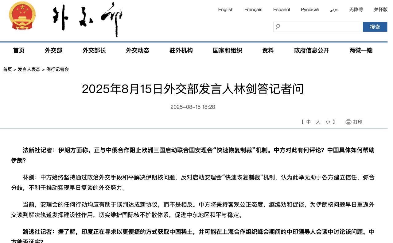 外交部网站 2025-08-15 18:28 法新社记者:伊朗方面称,正与中俄合作阻止欧洲三国启动联合国安理会“快速恢复制裁”机制。中方对此有何评论?中国具体如何帮助伊朗? 林剑:中方始终坚持通过政治外交手段和平解决伊朗核问题,反对启动安理会“快速恢复制裁”机制,认为此举无助于各方建立信任、弥合分歧,不利于推动实现早日复谈的外交努力。 当前,安理会的任何行动均应有助于谈判达成新协议,而不是相反。中方将秉持客观公正态度,继续劝和促谈,为伊朗核问题早日重返外交谈判解决轨道发挥建设性作用,切实维护国际核不扩散体系,促进中东地区和平与稳定。 路透社记者:据了解,印度正在寻求以更便捷的方式获取中国稀土,并可能在上海合作组织峰会期间的中印领导人会谈中讨论该问题。中方能否证实? 林剑:具体问题请向中方主管部门询问。