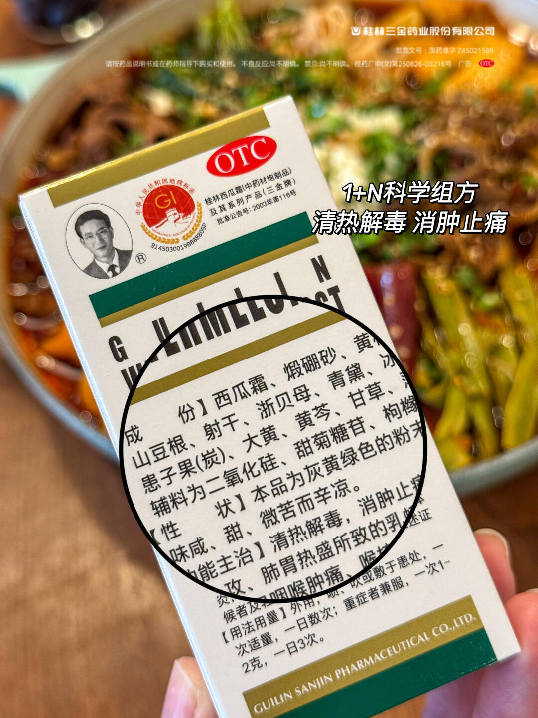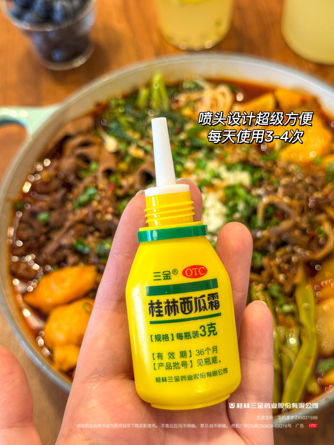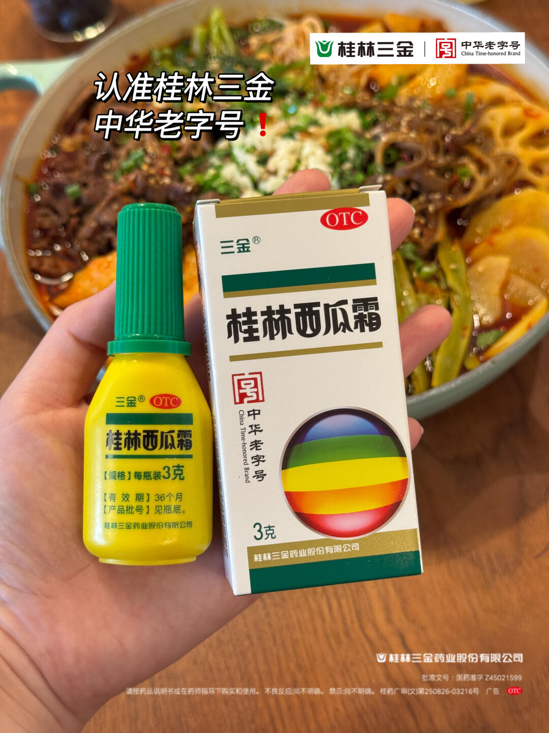 🔥过瘾归过瘾,重口吃完第二天,口腔溃疡、牙龈肿痛很容易找上门,连喝水都费劲,还好家里备着中华老字号桂林三金的桂林西瓜霜,里面主药——百年口喉良药西瓜霜,口腔溃疡和牙龈肿痛可用,适合像我这样的大馋虫。