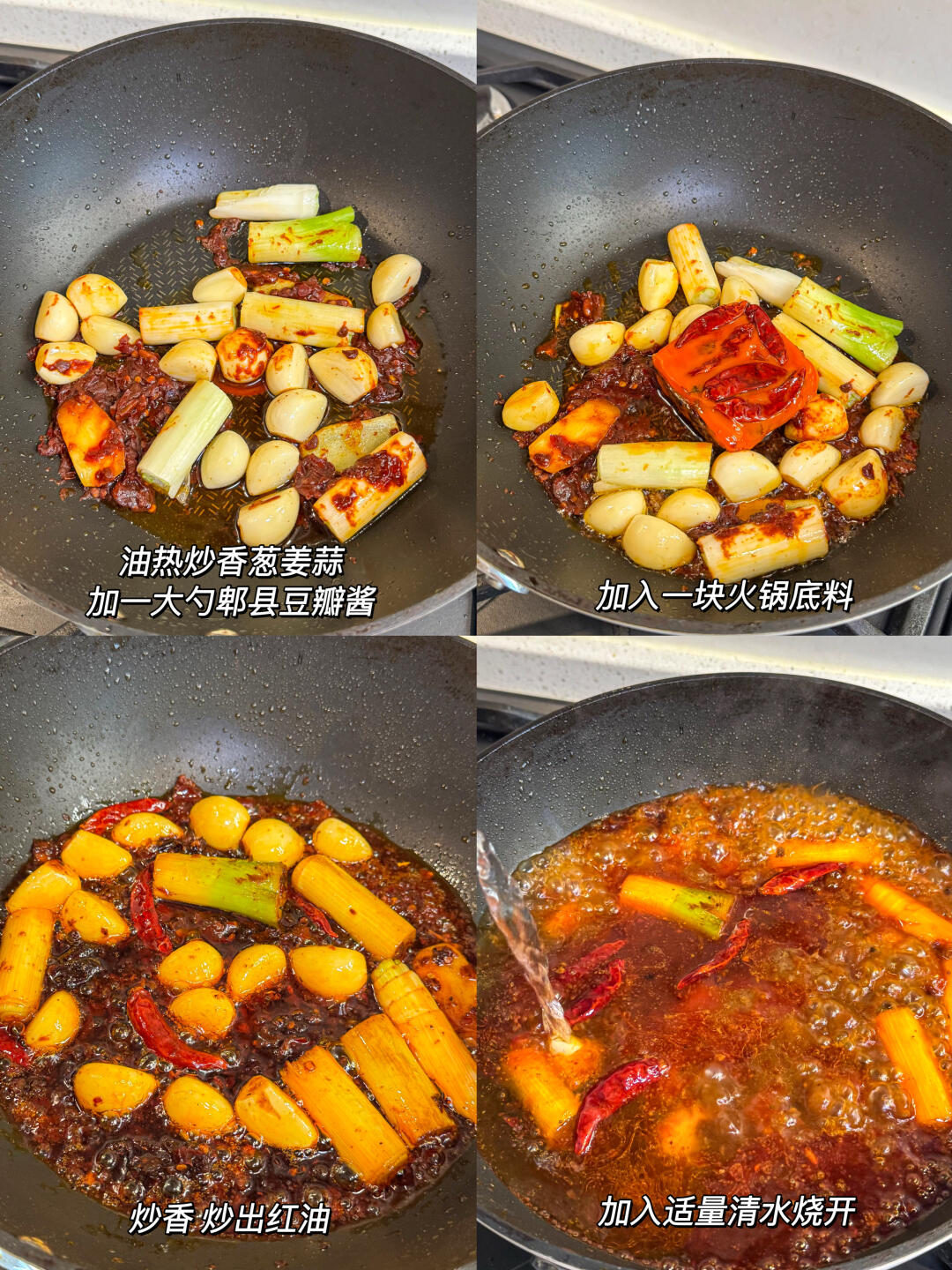 炒料:热油炒香豆瓣酱、火锅底料,加姜片、大葱段、花椒、干辣椒炒出红油,加开水煮沸。