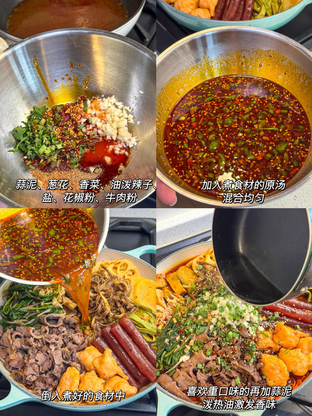 调味:碗中放大蒜水、花椒粉、辣椒油、盐、葱花,浇一勺滚烫的冒菜汤激香,倒入煮好的菜即可!