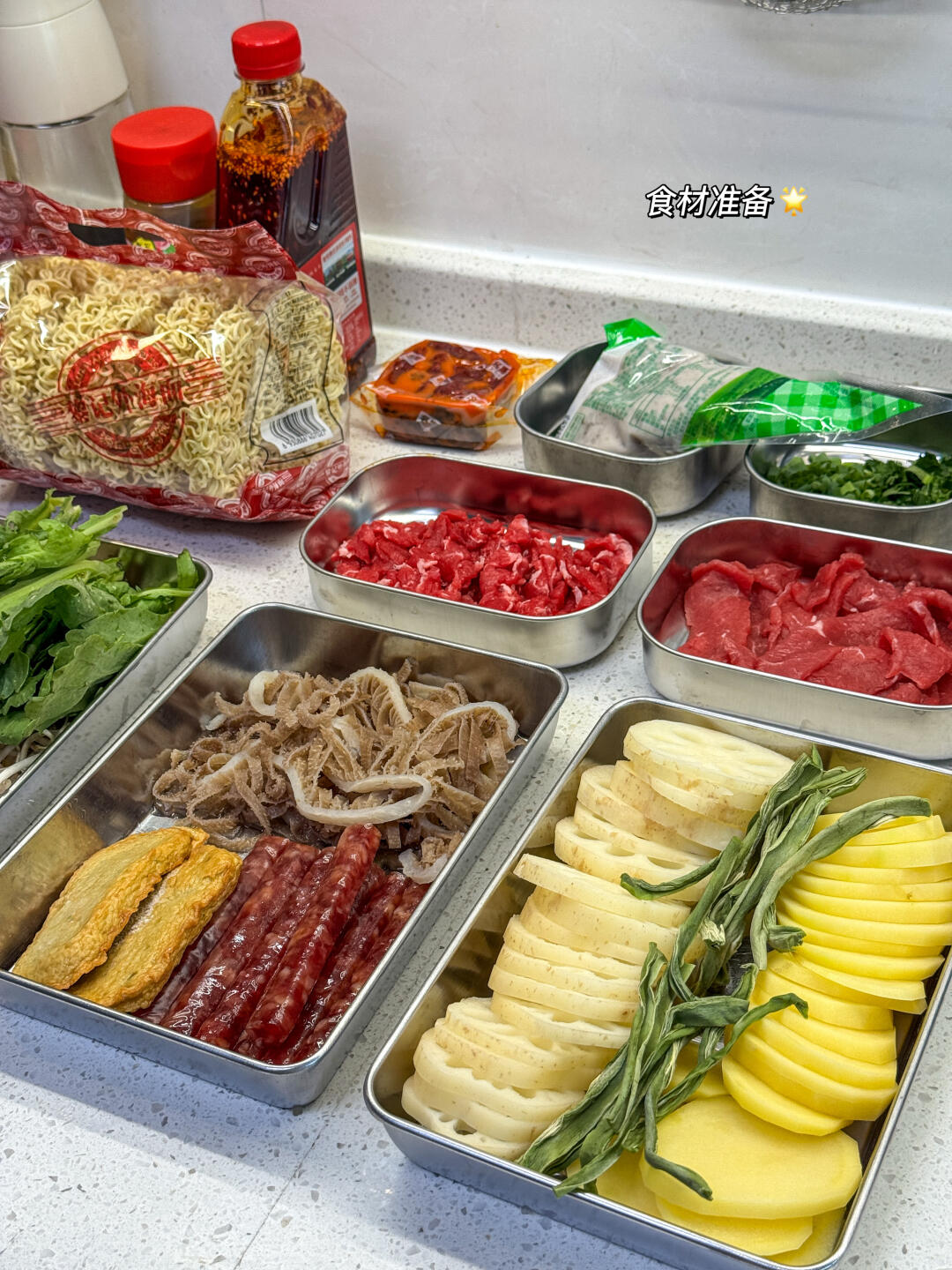 备菜:荤素搭配(毛肚、肥牛、腊肠、虾滑、丸子、贡菜、土豆片、藕片、青菜等)