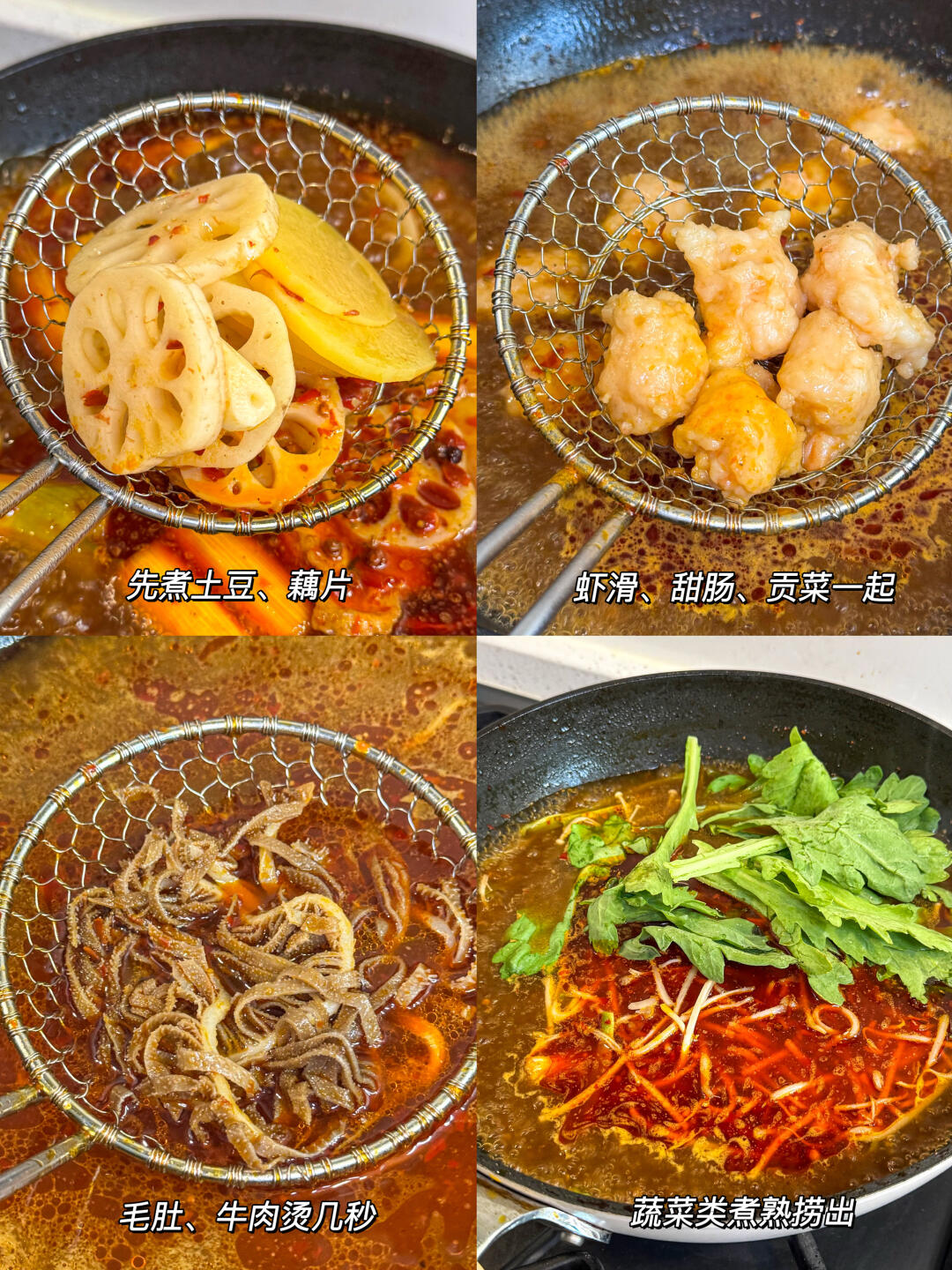 煮菜:先下耐煮食材(土豆、丸子等),再下易熟的肉和菜,煮至断生后捞出放入盆中。