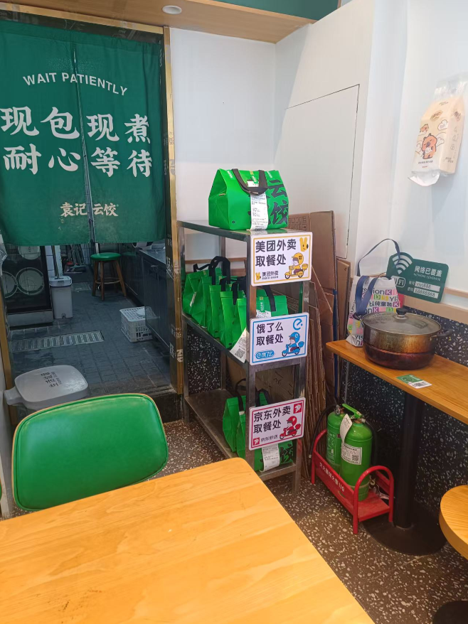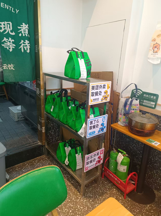 昨天,到一商家取外卖,我看到,商家把打包好的外卖餐品,都整齐地摆放在货架上,最上边一层是美团的餐品,中间层放的是饿了么的餐品,最下边一层放的是京东的餐品。