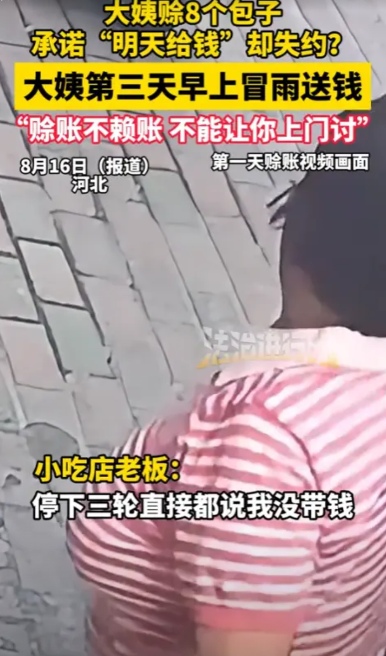 “这就是格局!”2025年8月,河北,一大妈早上买早餐忘了带钱,赊了8个包子,承诺第二天给钱却失约,不曾想,大姨第三天一大早,冒着雨去给老板送钱!她直言:赊账不赖账,不能让你上门讨!网友:诚实守信是最重要的!