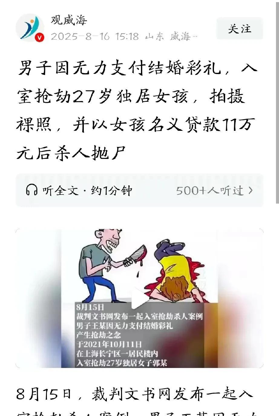 据观威海8月16日报道,男子王某因为一场彩礼闹剧,把自己送上了绝路。 王某和女友感情还算稳定,眼看着到了谈婚论嫁的地步。可女友家提出的彩礼金额,像一座大山一样压在了王某身上。 王某家庭条件一般,自己也没什么积蓄,东拼西凑还是凑不够这笔钱。 每次和女友因为彩礼问题争吵时,王某心里就像有团火在烧,又急又气,却又毫无办法。 日子一天天过去,彩礼的事始终没解决,王某的心态也逐渐发生了变化。 2021年10月11日,王某心里突然冒出一个疯狂又邪恶的念头,抢劫。他把目标锁定在了27岁的独居女孩郭某身上。 当天,王某鬼鬼祟祟地来到郭某居住的居民楼。他心里既紧张又兴奋,紧张的是怕被人发现,兴奋的是觉得马上就能弄到钱解决彩礼问题了。 进入郭某家中后,王某迅速控制住郭某,逼迫她交出银行卡。拿到银行卡后,王某发现这些钱还不够支付彩礼,又以郭某的名义通过某平台贷款了11万余元。 此时的王某已经完全丧失了理智,他担心郭某呼救引来别人,竟然想出拍摄裸照来威胁郭某的办法。 可即便如此,王某还是不放心,一咬牙,捂住郭某的嘴,用力掐住她的脖子,直到郭某不再动弹,窒息死亡。 看着眼前死去的郭某,王某心里一阵恐惧,但很快又被逃走的念头占据。 他匆忙将郭某的尸体装进行李箱,驾车一路开到江苏无锡,把尸体抛进了一条河道 以为这样就能毁尸灭迹,万无一失。 要想人不知,除非己莫为。王某没想到,警方很快就锁定了他。 案发后,警方迅速展开调查。通过小区监控,警方看到了王某可疑的身影;DNA比对结果显示,现场遗留的痕迹与王某吻合;电子数据也显示,贷款操作与王某有关。 而且,警方在王某手机里发现了拍摄的被害人裸照,车辆后备厢还检出了被害人的血迹。证据确凿,王某无从抵赖。 案件被提起公诉后,法院会如何审理呢? 一、王某的行为构成抢劫罪致人死亡。 二、王某拍摄裸照、抛尸等行为构成抢劫罪的“其他恶劣情节”,属于加重量刑依据。 王某在抢劫过程中,为防止郭某呼救,采取拍摄裸照威胁、抛尸灭迹等手段,严重侵犯被害人的人格尊严和生命权,造成恶劣社会影响。 根据最高人民法院《关于审理抢劫刑事案件适用法律若干问题的指导意见》,可认定为“其他情节特别恶劣”的情形。 法院在量刑时,将此类情节作为加重处罚的依据,符合罪责刑相适应原则。 然而,根据刑法理论中的“吸收原则”,若后罪是前罪的必然延伸或手段,则前罪吸收后罪,仅以重罪定罪处罚。 2023年8月18日,法院以抢劫罪判处王某死刑。 王某不服提起上诉,结果二审法院直接驳回上诉,维持原判。 目前,最高人民法院已经裁定核准死刑,王某的判决正式生效,这就意味着,他所剩的时日无多,只等执行判决。 关注@蜜蜂说法 ,多学法律少吃亏!