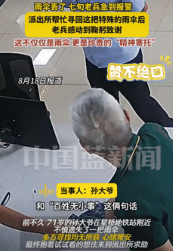 眼泪止不住了!浙江杭州,7旬老兵弄丢一把雨伞,急的赶紧来报警,不料,当民警帮忙找到之后,老兵感激的竟鞠躬道谢,而在得知原因后,也让人忍不住红了眼眶! 据中国蓝新闻8月18日的报道,事情发生在杭州,不久之前,大爷在某地铁站附近溜达时,意外把伞给弄丢了。 当时他就急的不行,想尽各种办法去寻找,可惜都没有成功,无奈之下,只好抱着试一试的心态,来到派出所寻求民警的帮助。 毕竟丢的只是把雨伞,并非是什么值钱的东西,况且离事发之时,已经过去了好几天,找起来的话恐怕难度也不小。 当了解到具体情况后,民警通过监控得知伞被人给捡走了,随后经过仔细筛查后,确定了几个可能是捡东西的人。 就这样,在挨个打电话联系后,才确定到底是哪一位,于是便成功找回了雨伞,接着就联系大爷,让他来所里拿吧。 当得知这个好消息后,大爷马不停蹄的就过来,在拿到雨伞的那一刻后,便对着民警深深的鞠了一个鞠躬。 至于大爷这样做的原因,其实是因为在他退伍后,大爷的老连长曾过来看望过他一次,这把伞就是老连长送的礼物。 同时还因为老连长在去年离开了人世,所以这把伞具有非凡的意义,不仅是大爷寄托思念的东西,更是一个精神寄托。 那么对于这件事情,您有什么想说的呢?