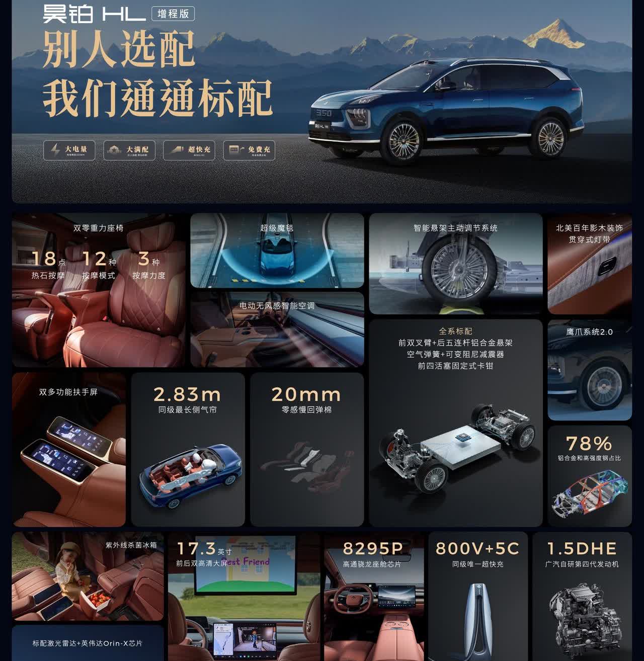 广汽昊铂 HL 增程版上市,26.98 万起售。 -800V + 5C + 60kWh 同级最大电池容量 + 广汽自研第四代 1.5DHE 发动机; -标配激光雷达,采用 Momenta 辅助驾驶解决方案; -搭载 8295P 座舱芯片; -标配双零重力座椅,具备 18 点热石按摩、12 种按摩模式、3 种按摩力度; -标配前双叉臂 + 后五连杆铝合金悬架、空气弹簧 + 可变阻尼减震器 、前四活塞固定式卡钳,魔爪系统 2.0 ; 增程车上60kWh大电池,纯电续航能跑350km,基本上解决了一周通勤的基础「痛点」,再加上800V+5C,10分钟补能210km,当个纯电车开也未尝不可。照这么看,其实昊铂 HL 增程版在同级别还是有一定竞争力的,你怎么看?【来自懂车帝车友圈】