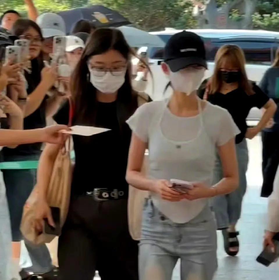 #黄杨钿甜风波后首露面# 风波后黄杨钿甜现身横店,在人群簇拥下为《冰湖重生》补拍工作亮相;浅灰紧身上衣配牛仔裤,头戴黑帽口罩遮面,一路友好接过粉丝递来物品,状态自然开启工作节奏~