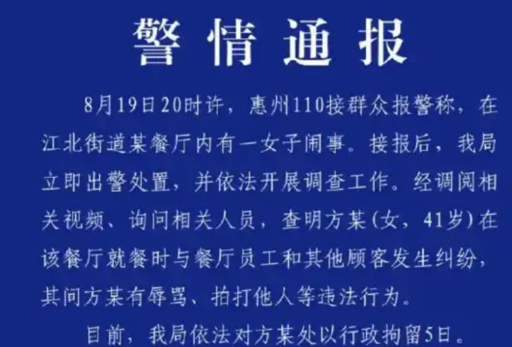 据star星视频8月21日报道称,广州惠州内一名女子跟快餐店的服务员发生争执,同时还殴打了劝架的男性顾客。如今,女子已经被刑拘。