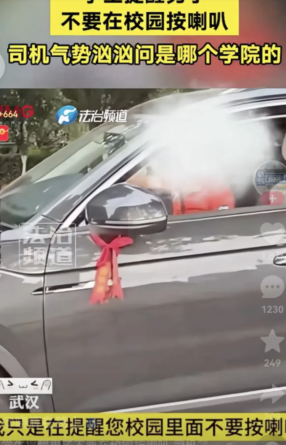 一男子在校园里开车按喇叭,旁边的学生看到后,急忙提醒司机,在校园里最好不要按喇叭,没想到的是,男子不仅没有意识到自己的错误,反过来还气势汹汹地质问学生:“你是哪个学院?”感觉好像自己做错了事情,还挺理直气壮的。