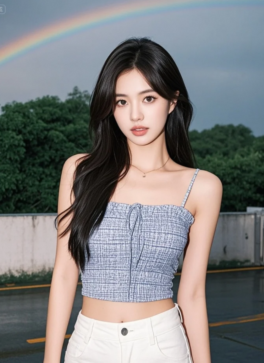 雨水洗净铅华,彩虹为幕,她便是天地间最纯粹的色彩。