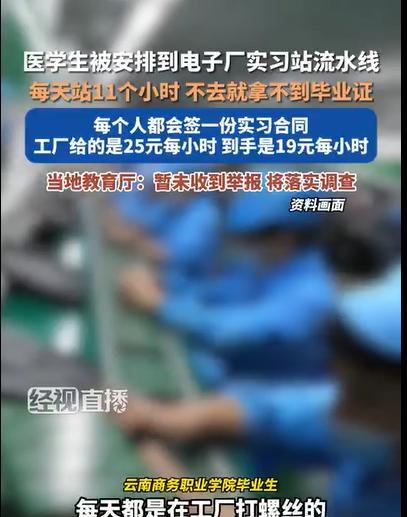 这事儿太离谱了!学校强制学生实习还克扣学生工资。600多个毕业生被学校逼着去工厂“打螺丝”,还美其名曰“实习”。不干?不给毕业证!这不是明摆着欺负学生吗? 近日视频曝光,云南商务职业学院学校以“实习”为名,强制学生到工厂从事与专业无关的流水线工作,并以不参加实习就不发毕业证相威胁。 学生每天站立工作11小时,工厂支付的报酬为25元/小时,但学校仅发放19元/小时,每小时克扣6元。这种行为是对学生劳动成果的直接剥削,严重损害了学生的经济权益。更令人质疑的是,这6元的去向不明,学校未对此作出任何透明解释。 学生上学是为了当廉价工人吗?!这种“实习”跟专业八竿子打不着,纯粹浪费时间,还毁身体、磨人心。学校这是拿学生当摇钱树,跟工厂合伙坑人,压根儿没把学生当回事儿。职业教育这么搞,学生和家长还怎么信得过? 教育部门应介入调查,严厉追究学校及相关责任人的责任,规范职业教育中的实习管理,防止类似事件再次发生。